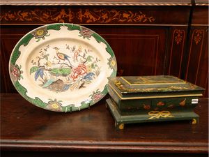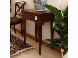 h cm 70x54x37 XX secolo interamente intarsiati in legni di frutto ad imitazione dello stile Maggiolini, alcuni [..]