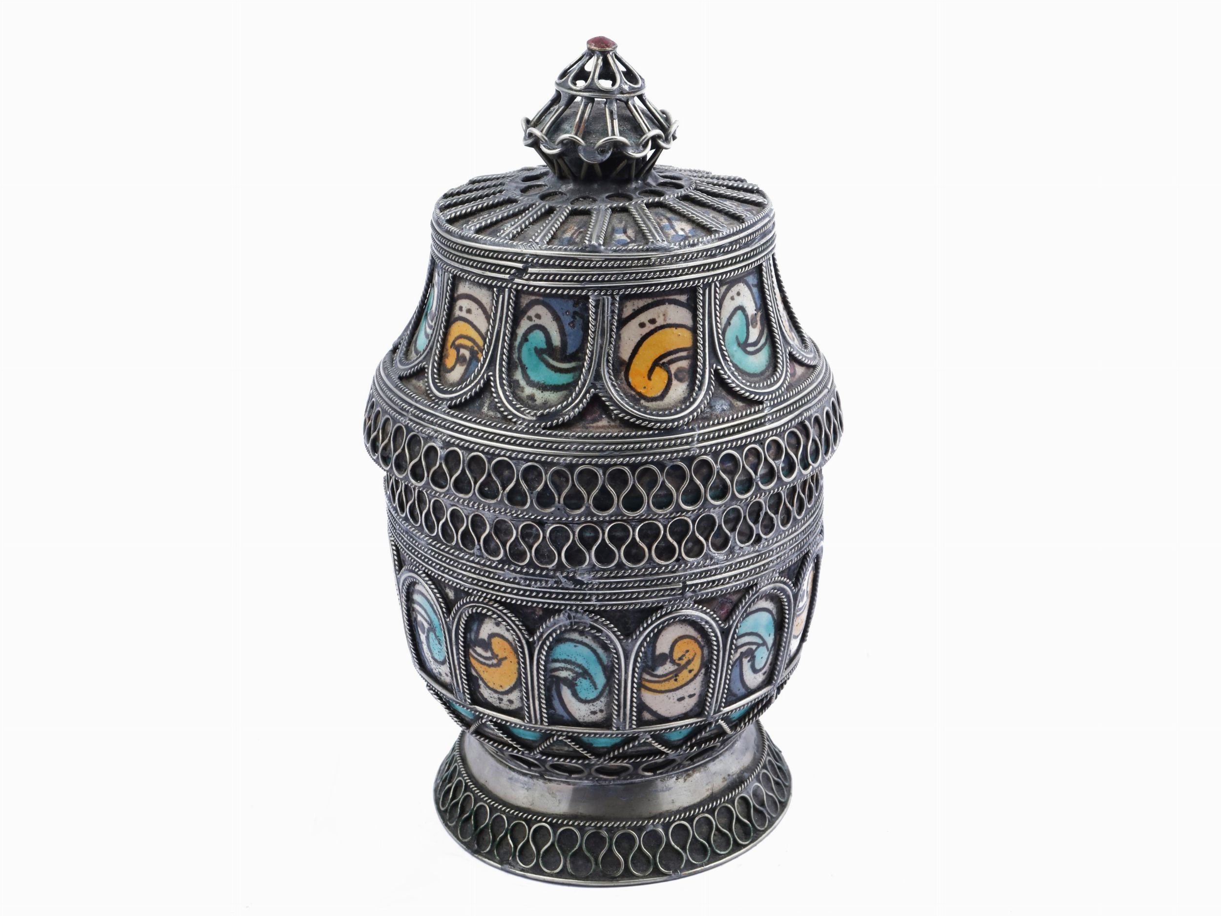 Marocco, metà del XX secolo coperchio incernierato con montatura traforata e inserti in ceramica dipinta nei toni dell'azzurro e dell'arancio