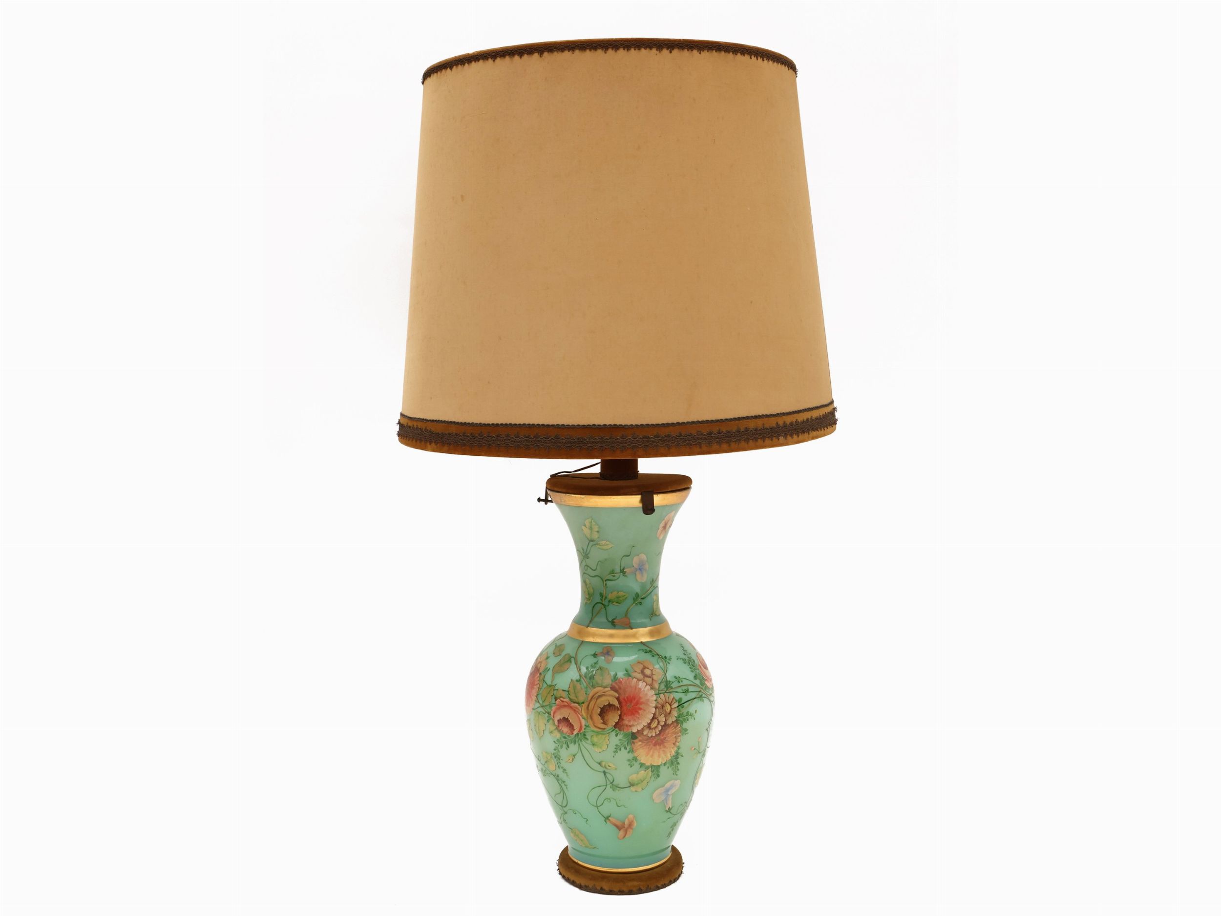 Francia, seconda metà del XIX secolo dipinto con motivi floreali policromi, montato a lume, con paralume, lievi difetti