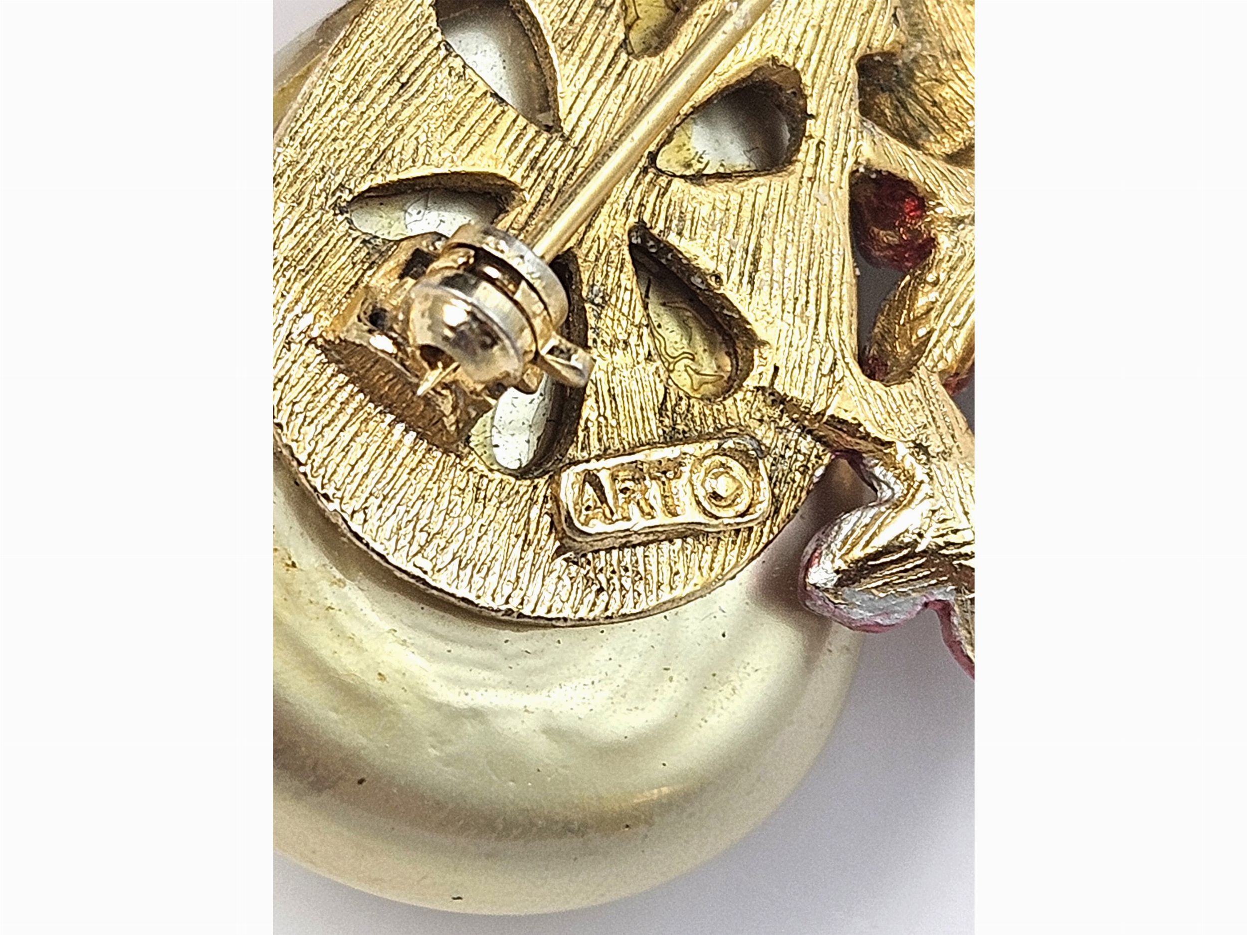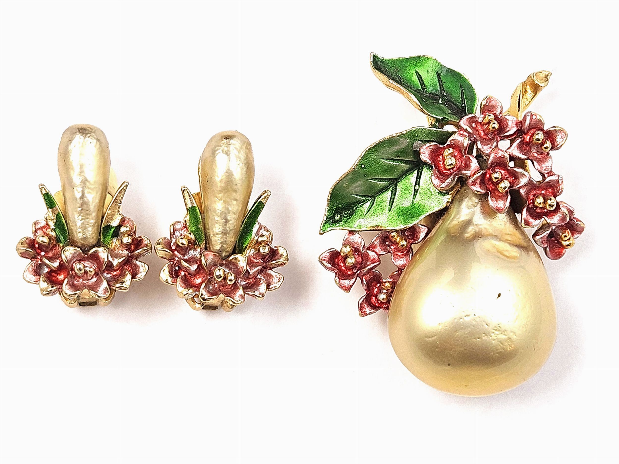 America, Anni Cinquanta/Sessanta in metallo giallo con grandi perle barocche simulate con motivo floreale in smalto nei toni del rosa e del verde, spilla realizzata a forma di pera
