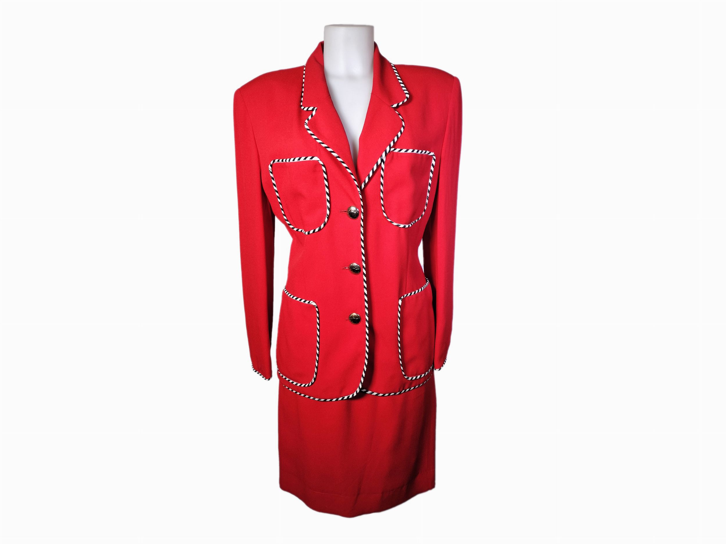 Anni Ottanta composto da una giacca con profili bianchi e neri, revers ad angoli arrotondati, quattro tasche, bottoni in metallo firmati ed una gonna corta, dritta a tubino (2)