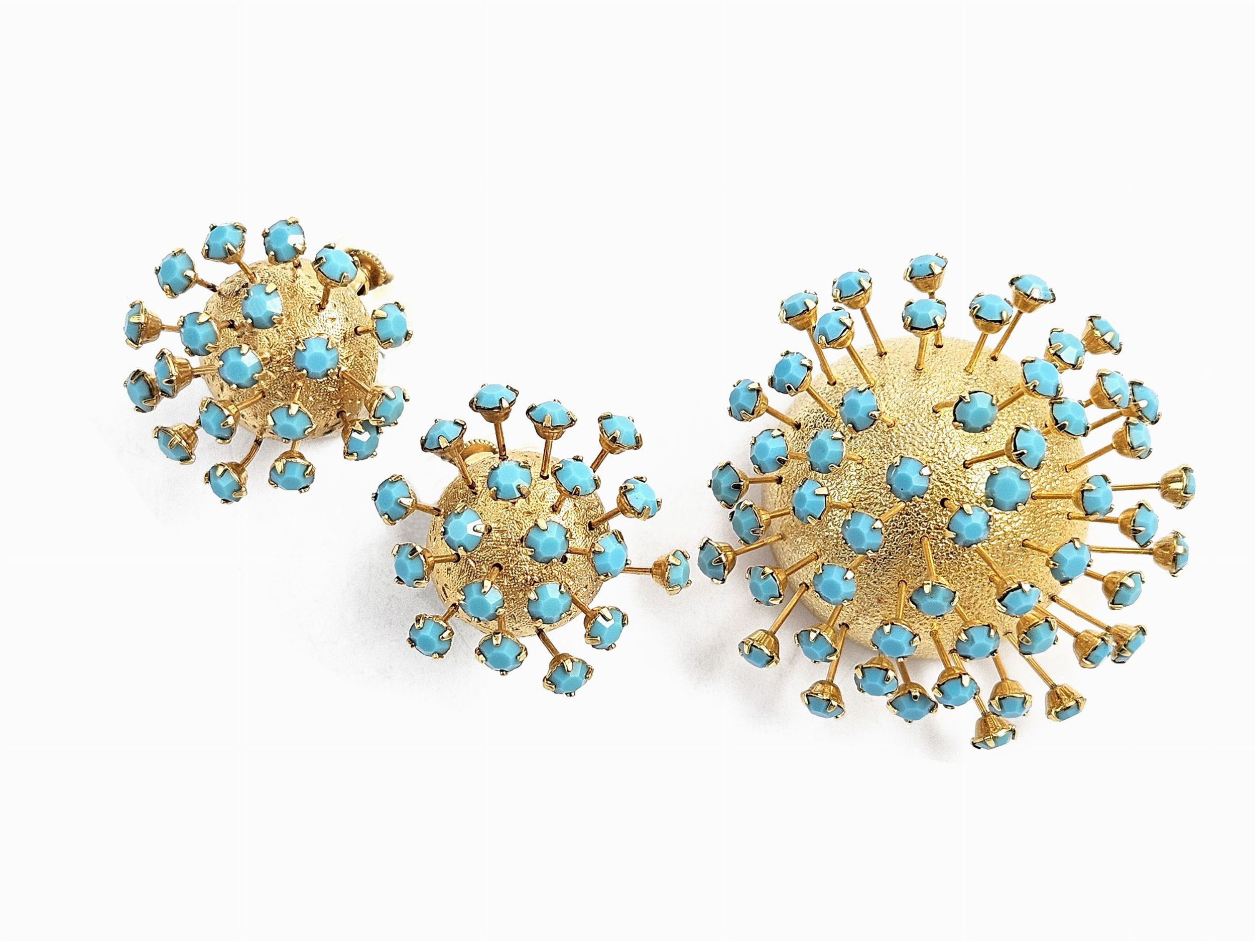 America, Anni Cinquanta/Sessanta composta da spilla e orecchini a clip realizzati come dei puntaspilli in metallo giallo con pietre color turchese con effetto tremblant