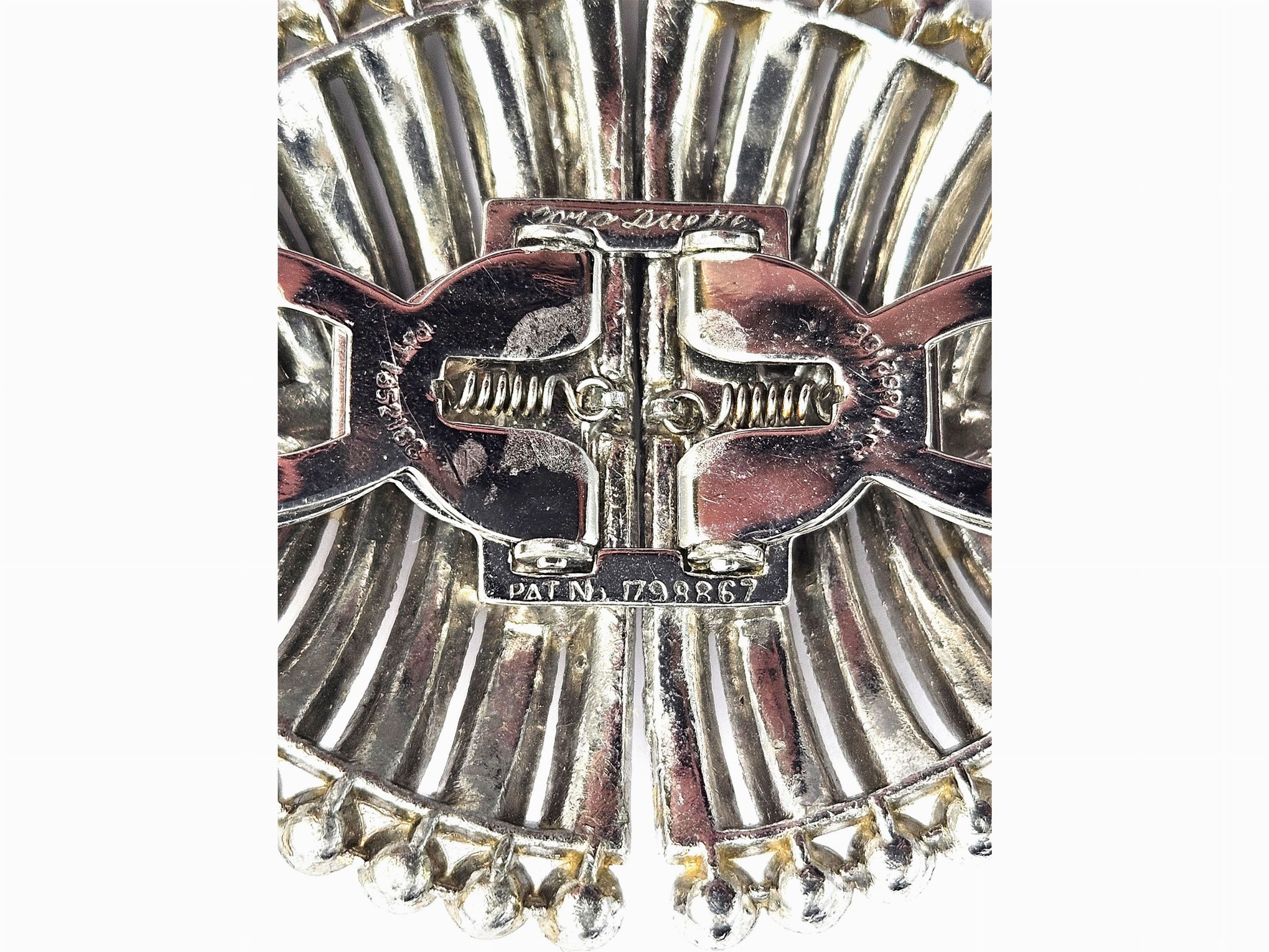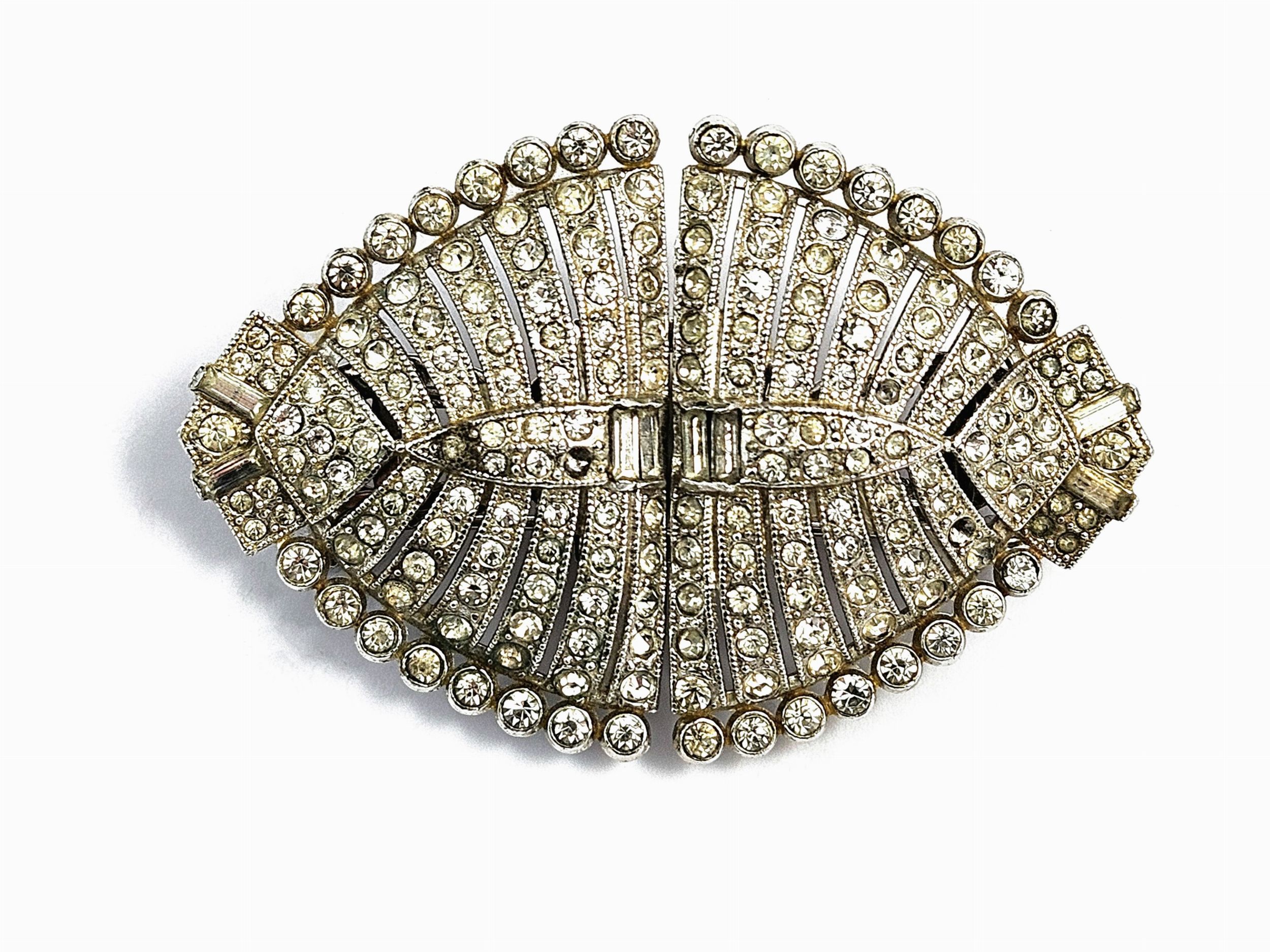 America, Anni Quaranta/Cinquanta di forma ovale realizzata come due spille separabili in metallo bianco con pavé di strass incolore, lievi difetti (mancante uno strass)