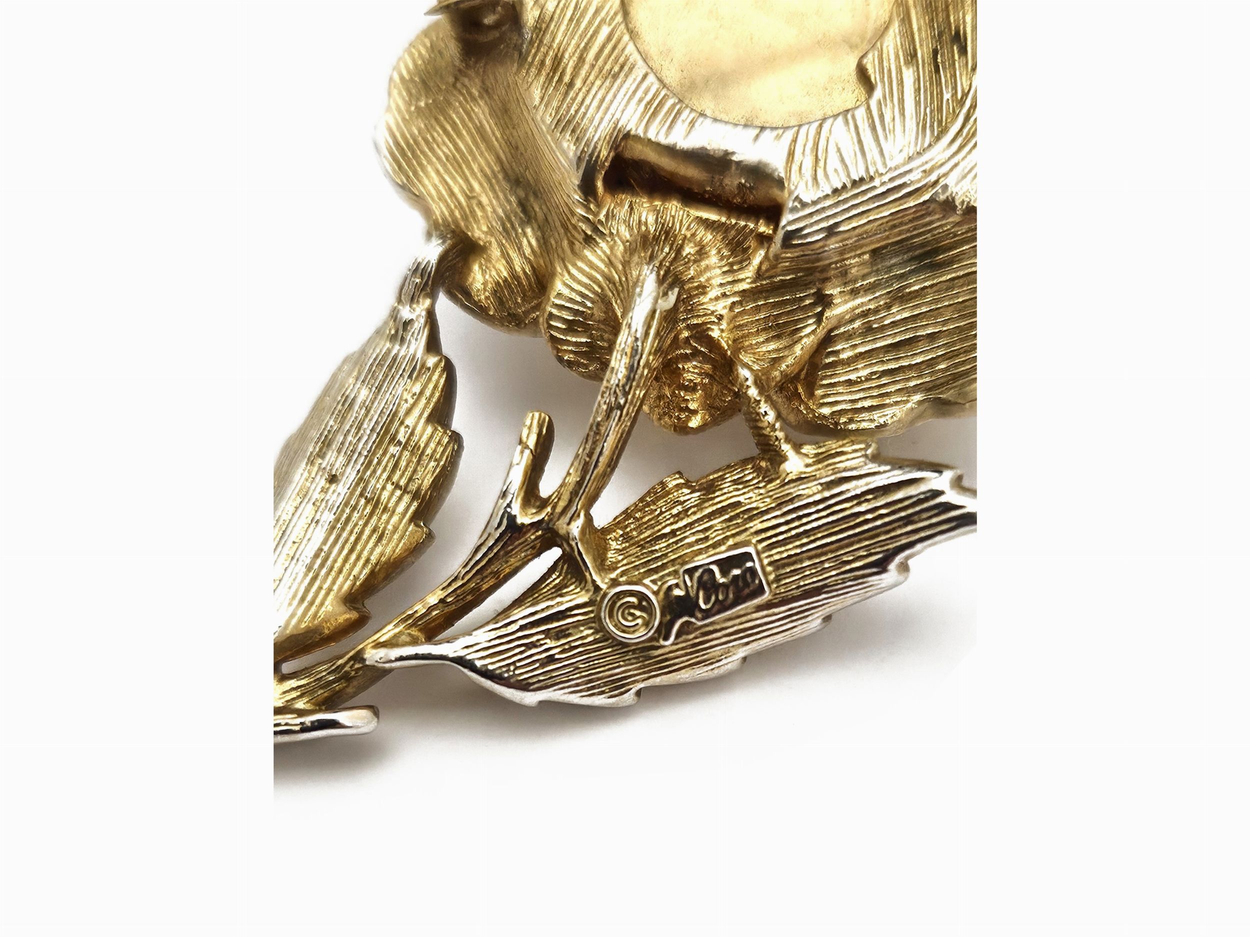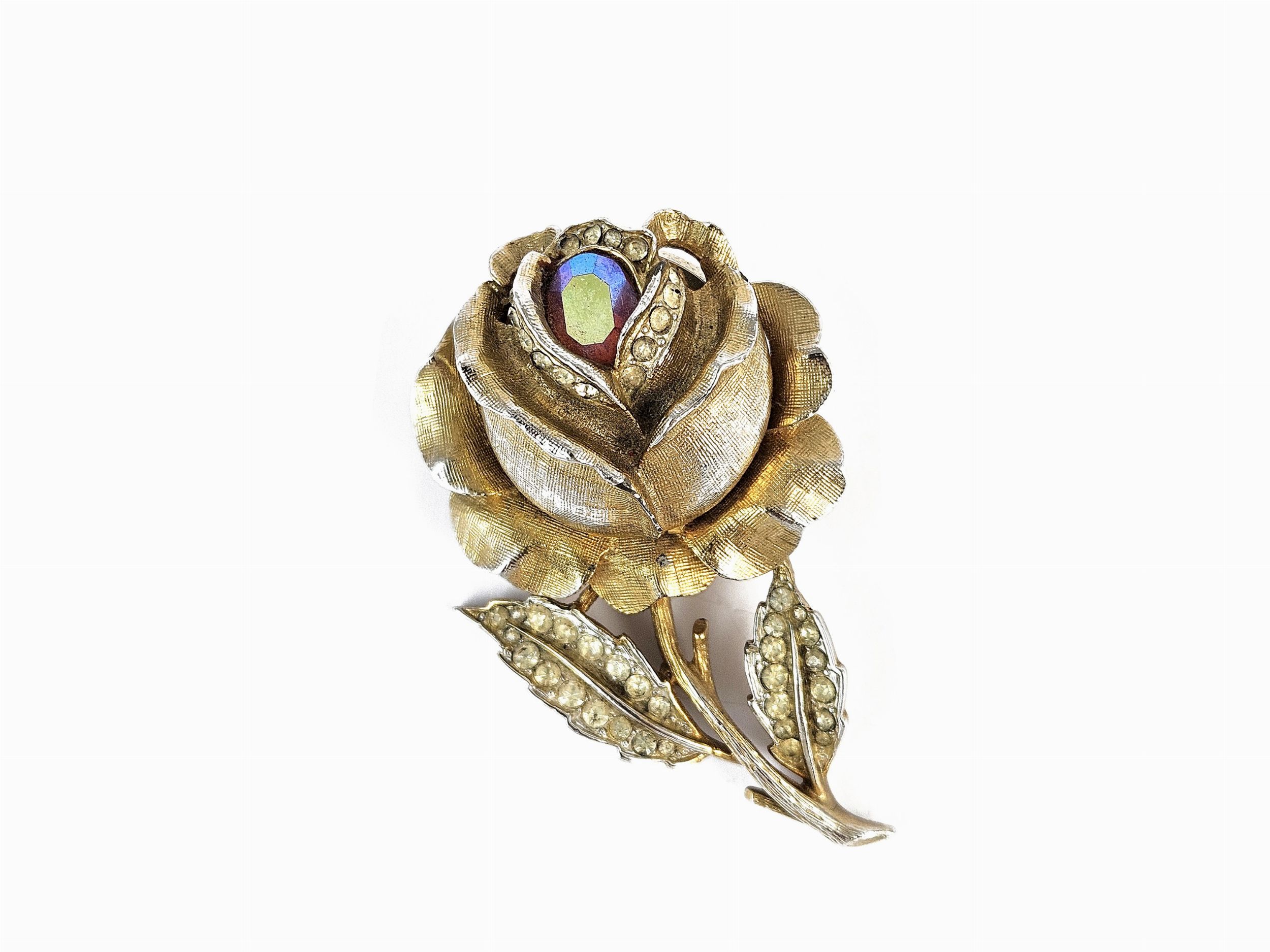 America, Anni Cinquanta realizzata a forma di rosa, in metallo giallo satinato con strass incolore e aurora boreale; funzionamento dell'orologio da verificare