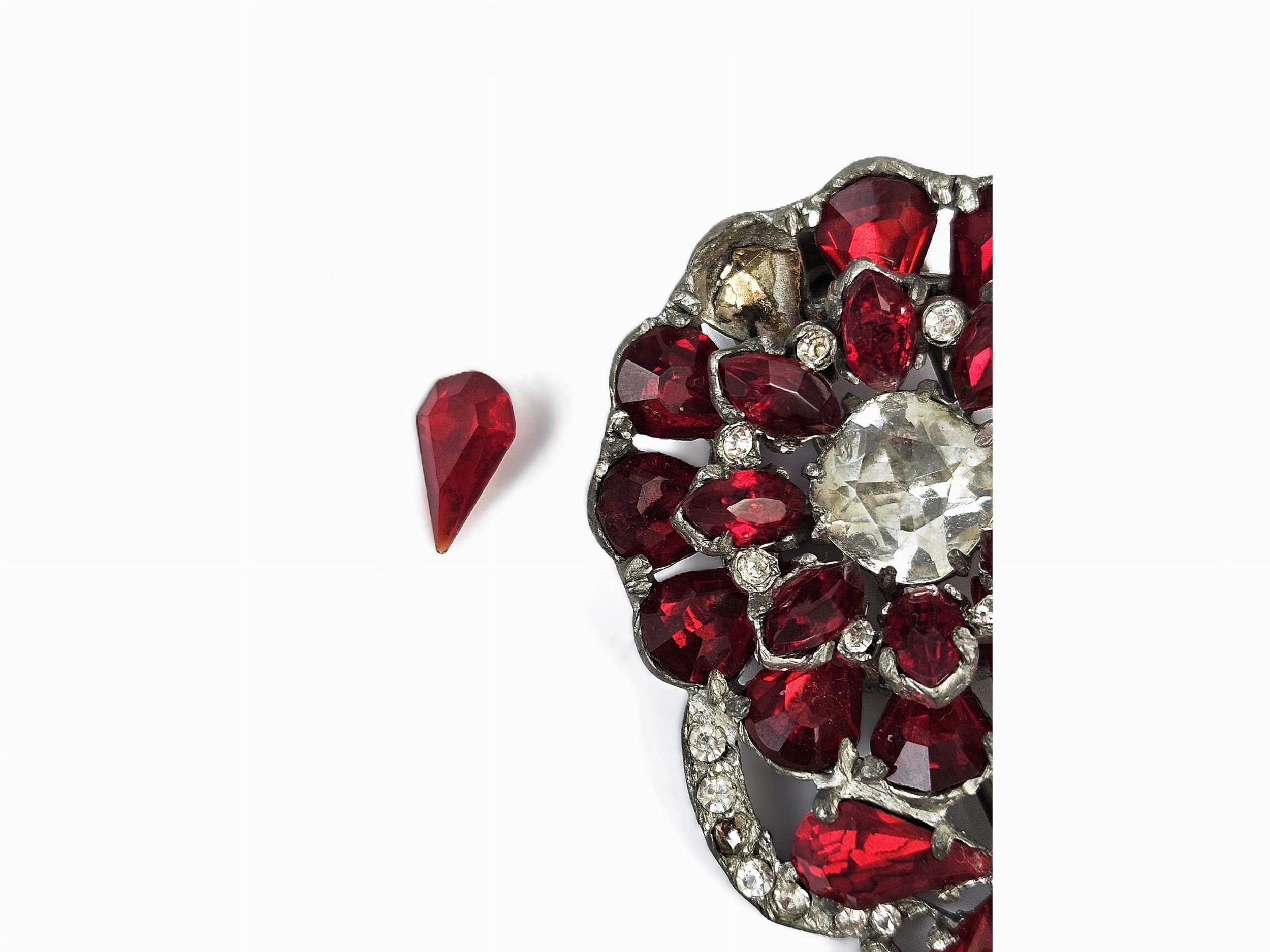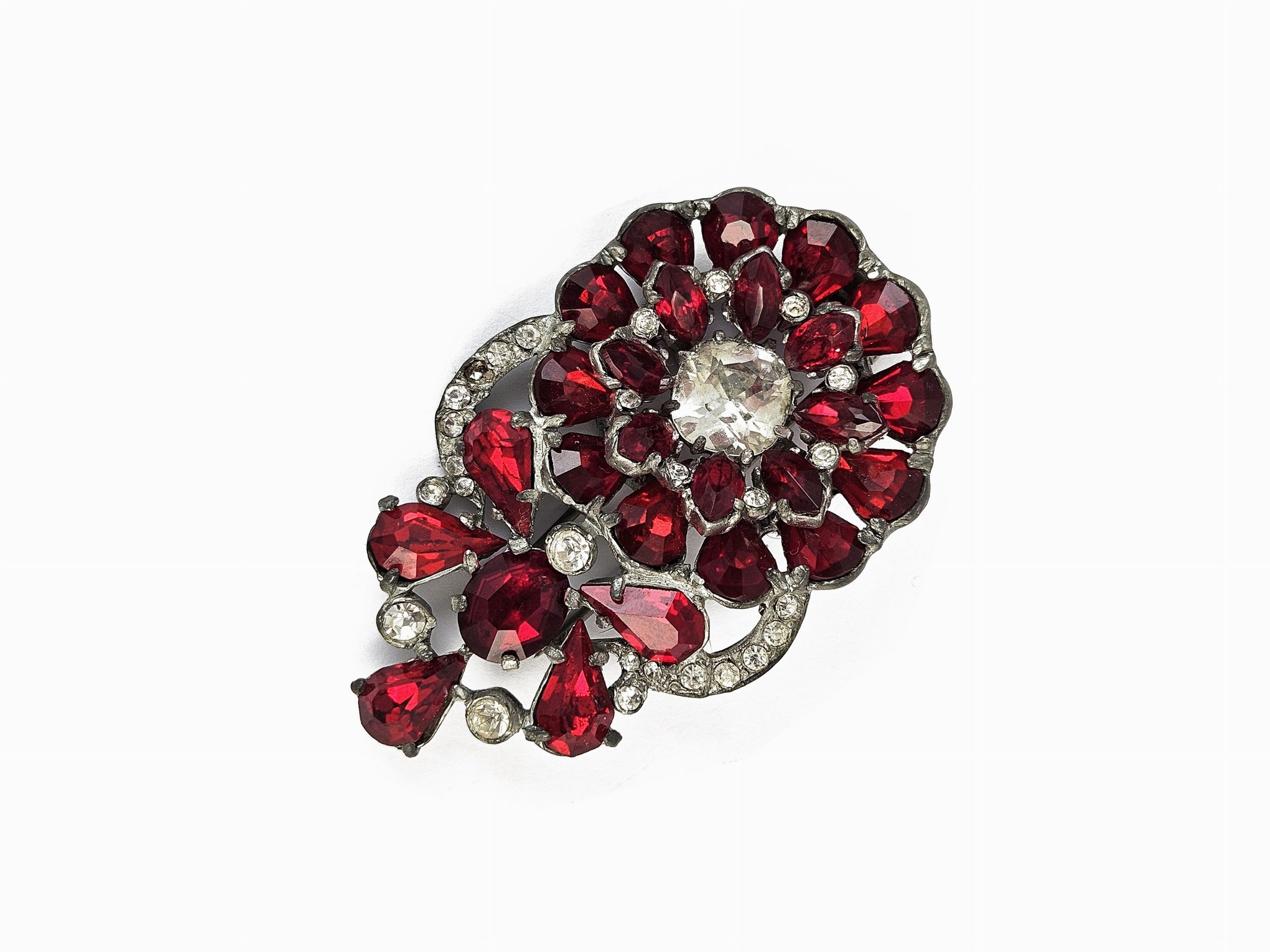 America, Anni Quaranta realizzato come un fiore racchiuso da volute, in metallo bianco, con grandi strass color rubino e incolore, lievi difetti (uno strass staccato) e segni d'uso