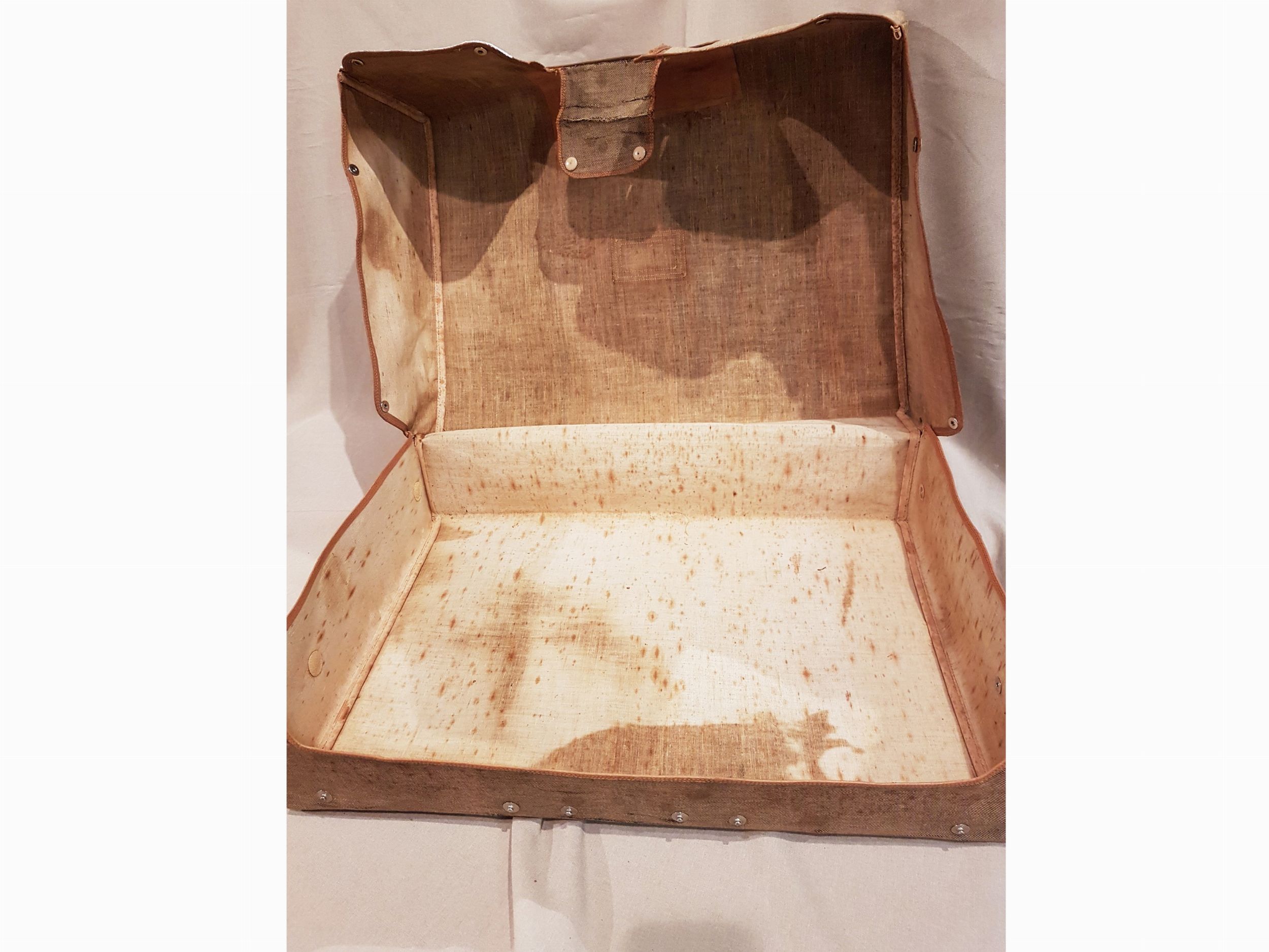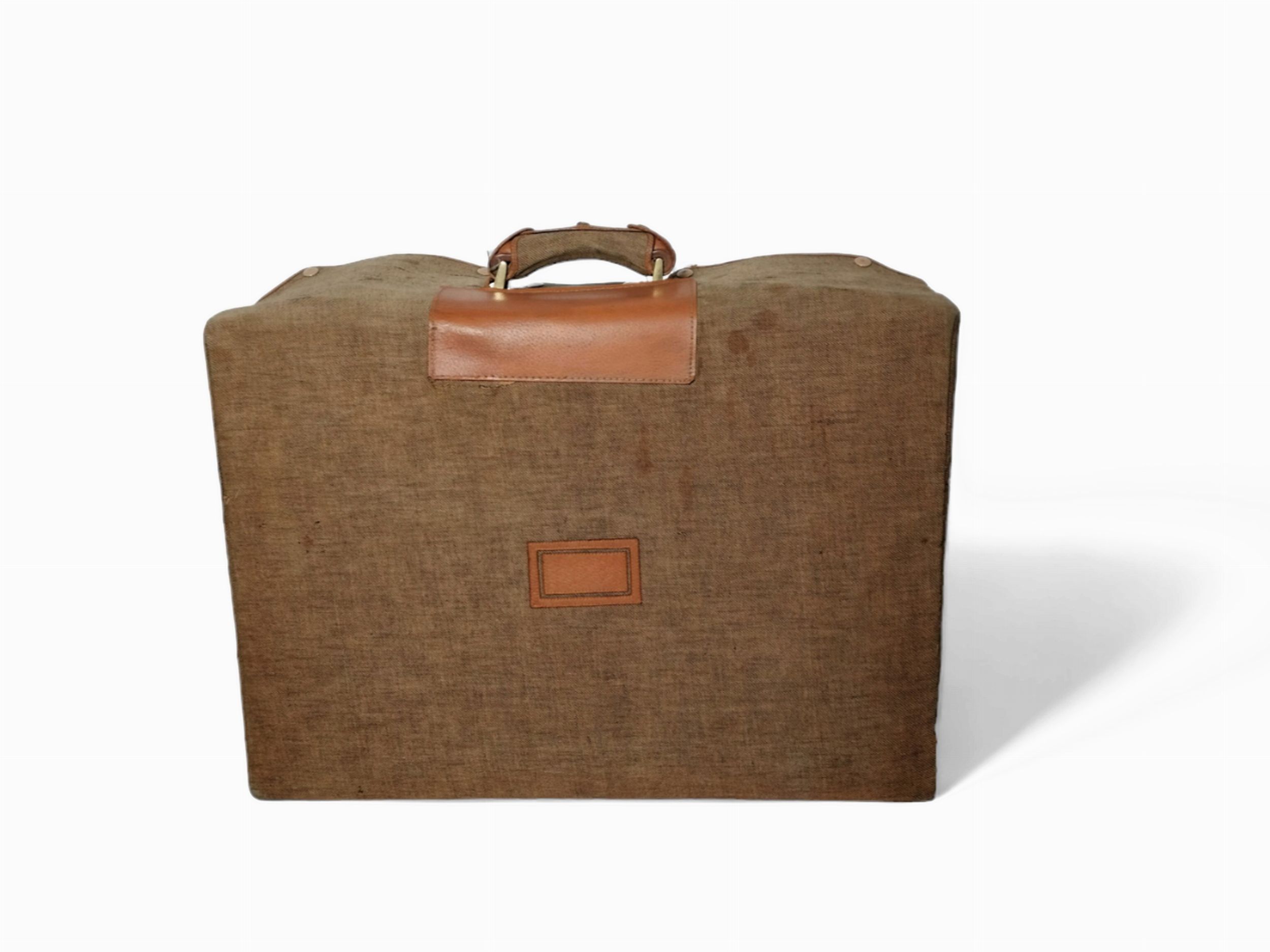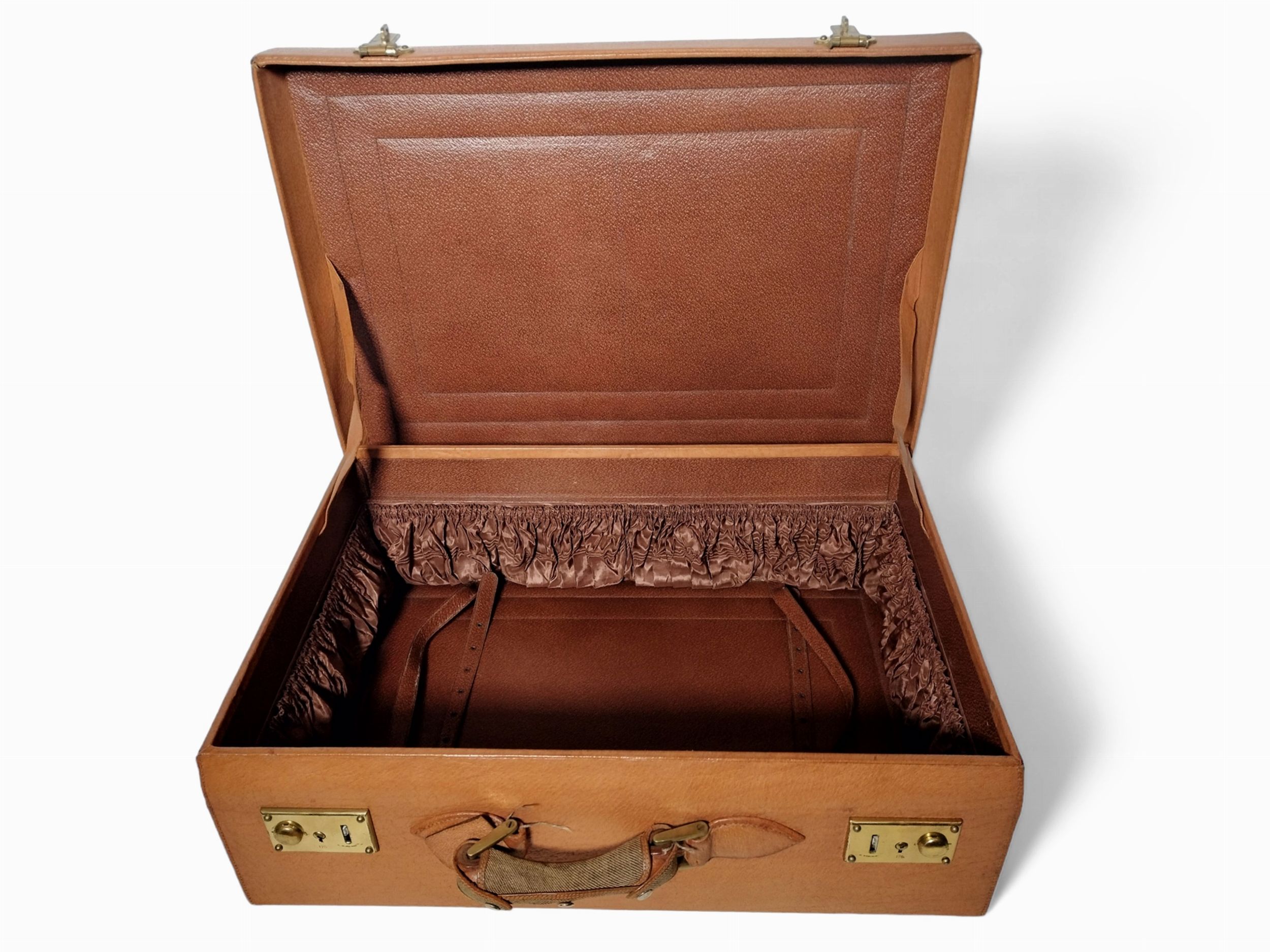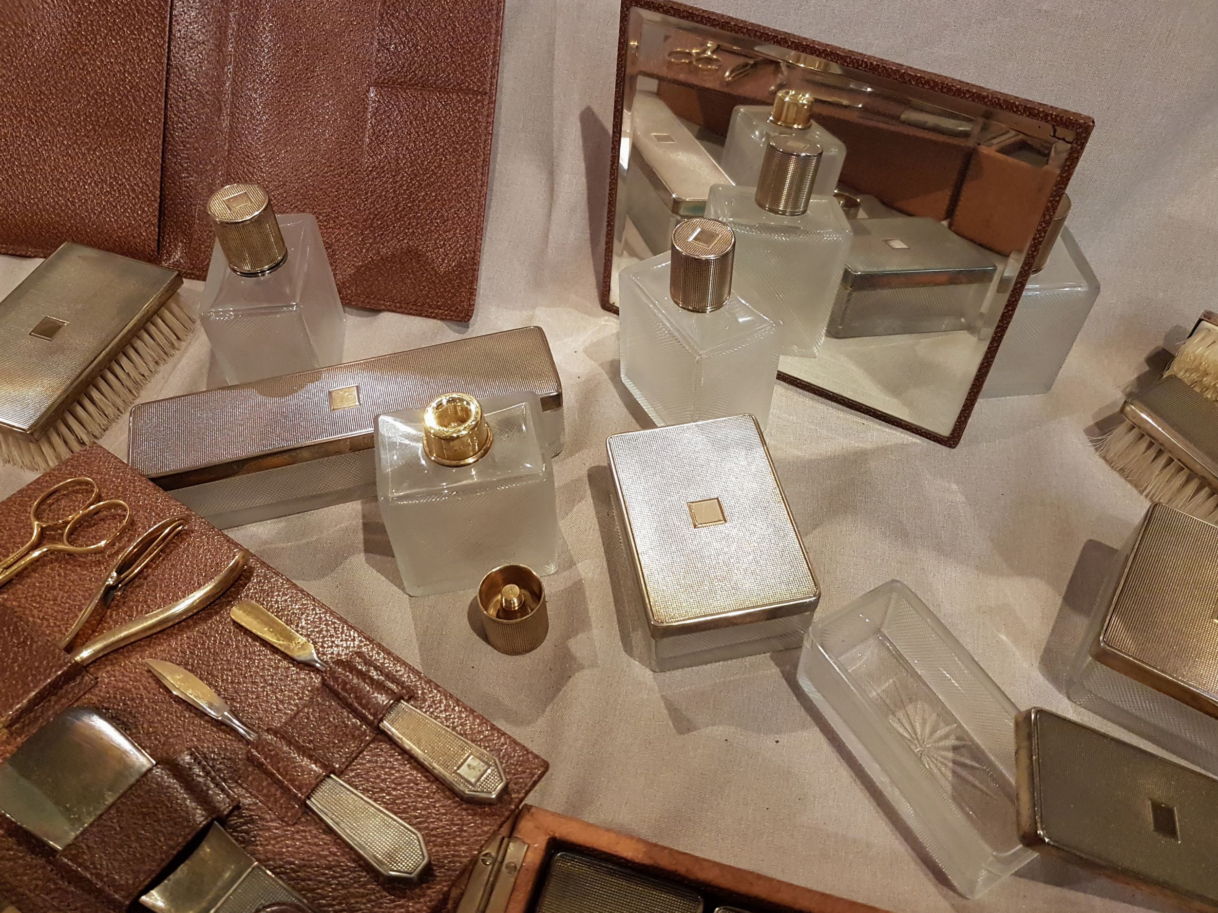 composto da valigia in cervo e cinghiale, corredata da fodera di protezione esterna in tela e cuoio (alcune macchie e difetti d'uso), abbinata a valigetta necessaire en pendant, anch'essa corredata da fodera esterna, contenente sei scatole in vetro molato di varie forme e dimensioni con coperchi in argento satinato, quattro flaconi con tappi in argento, tre spazzole in argento, un set con attrezzi da manicure e calzascarpe con dettagli in argento, uno specchio con custodia in pelle ed alcuni contenitori estraibili in pelle; le due valige si presentano in perfetto stato di conservazione; il necessaire appare inusato