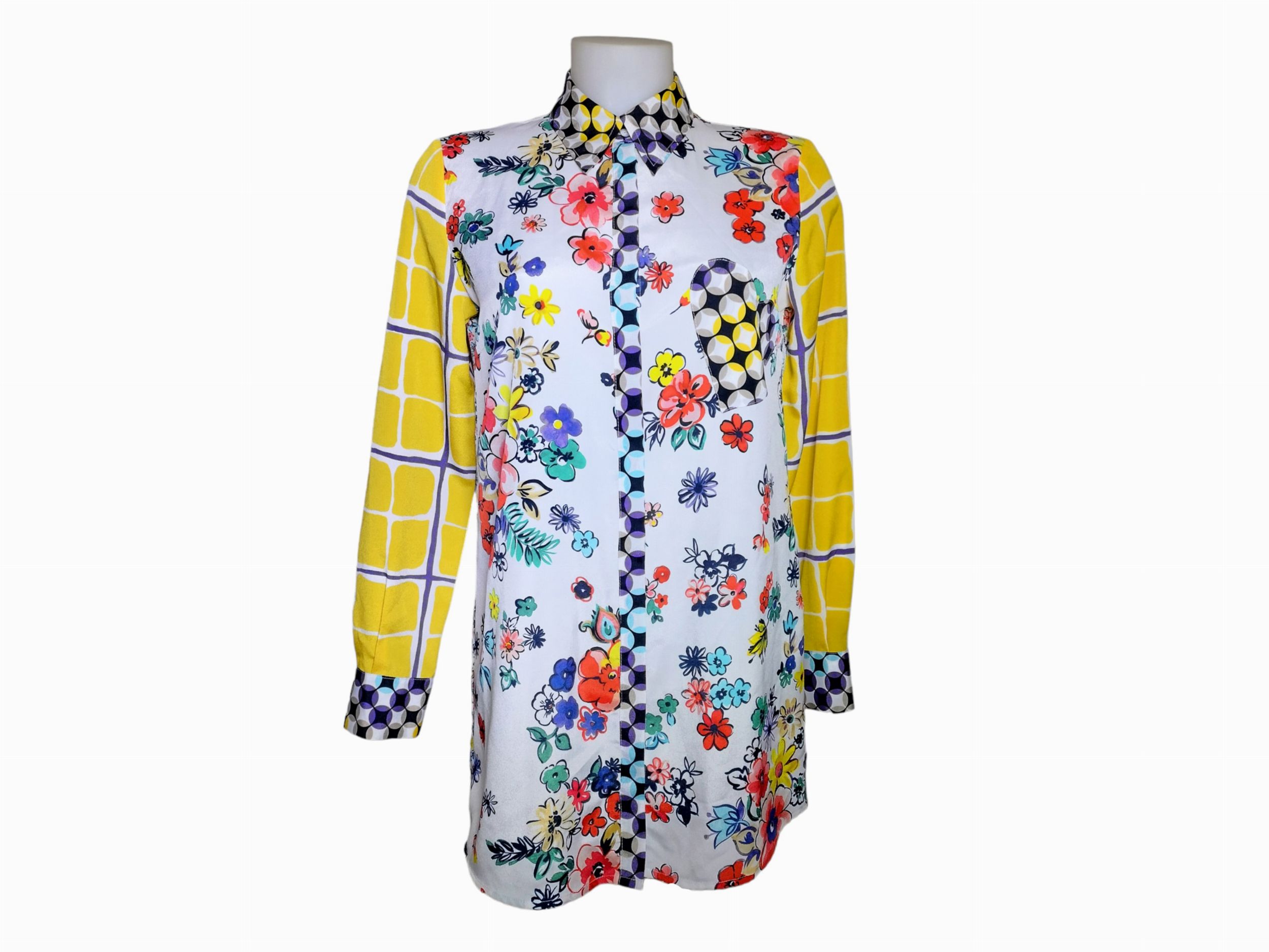 motivi geometrici nel giallo sulle maniche, colletto a motivo optical che riprende il taschino a forma di cuore