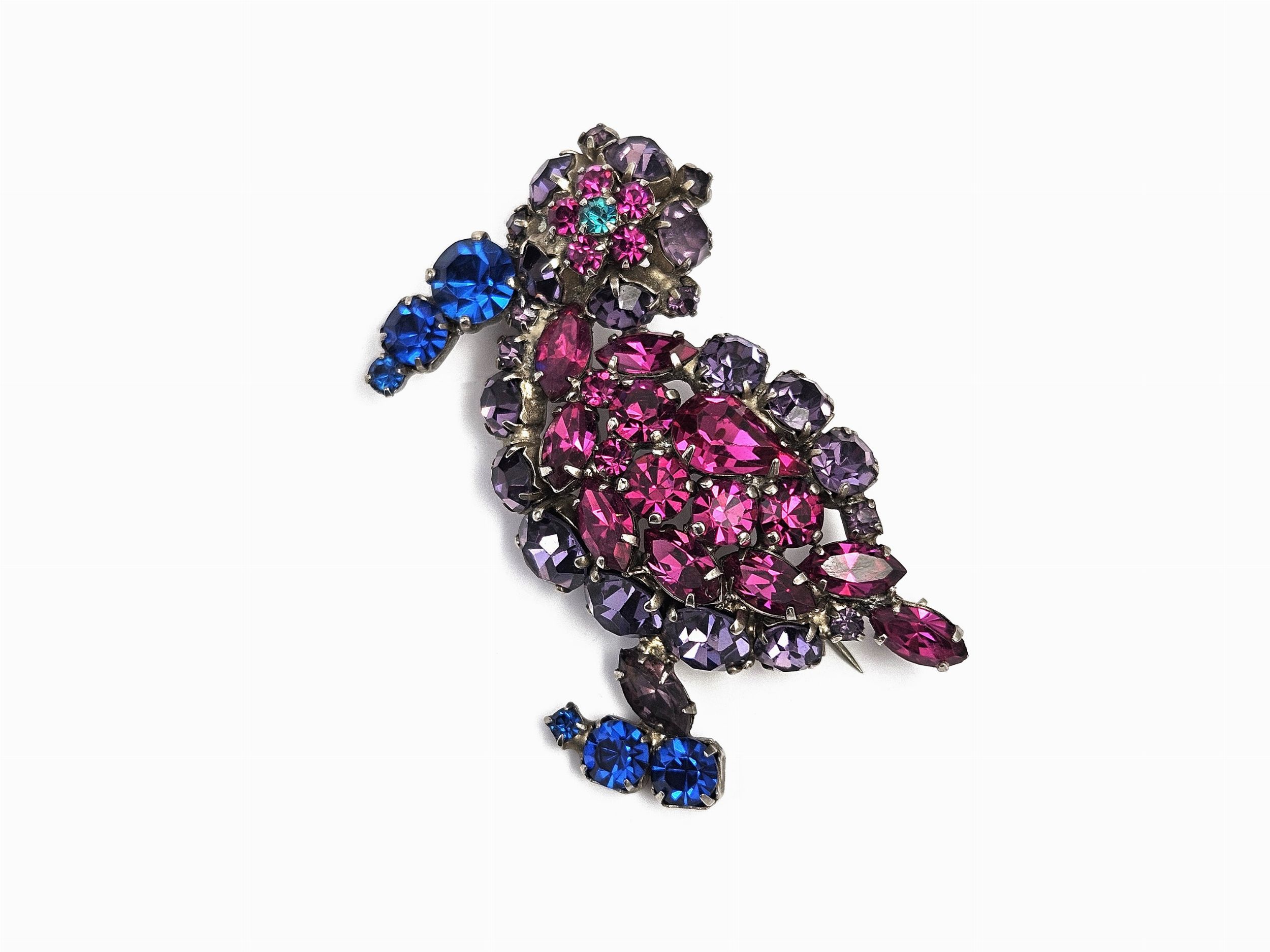 Anni Sessanta realizzata a forma di dodo in metallo bianco, decorato con strass color rubino, zaffiro e ametista