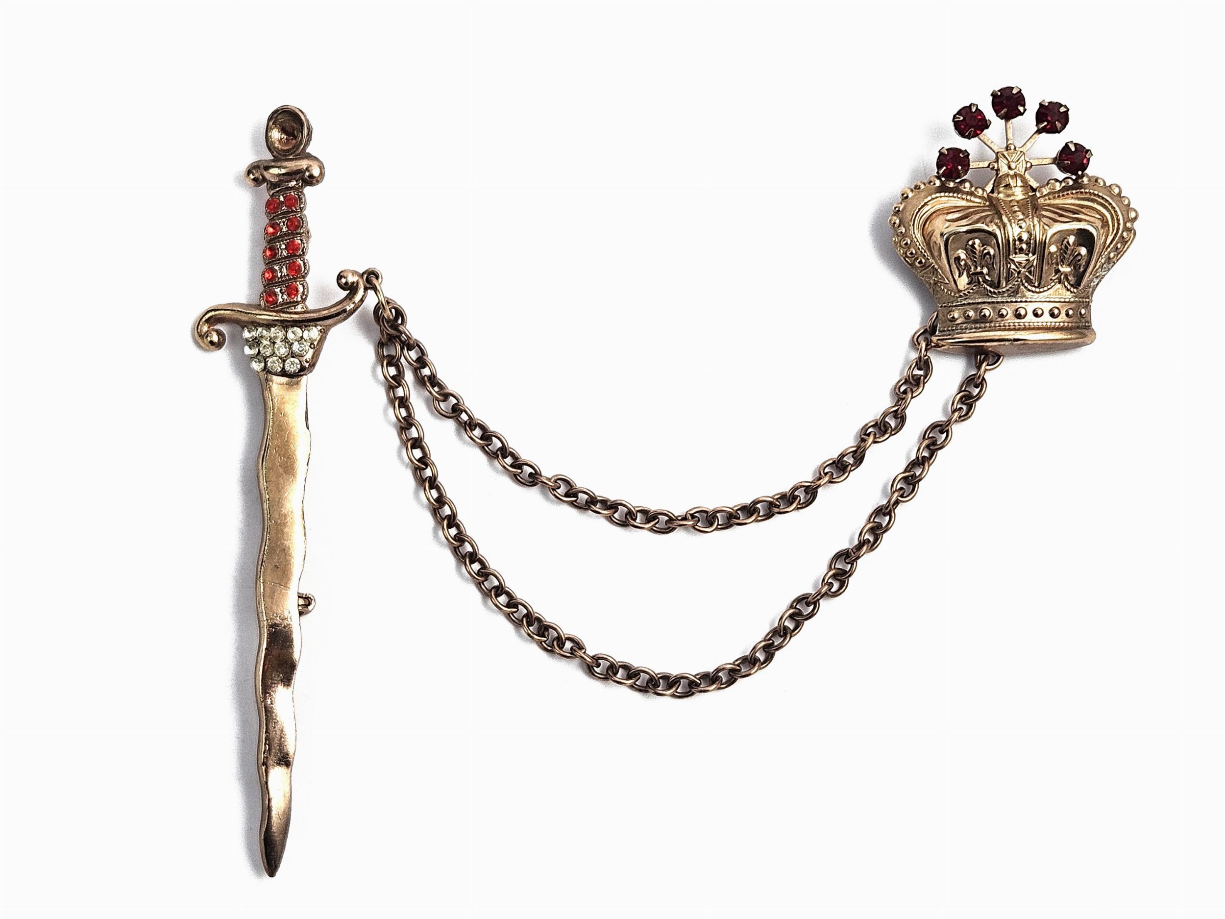 Anni Quaranta realizzata come una corona e una spada unite da una catena a due fili, in metallo color rame con strass color rubino e incolore, lievi segni d'uso