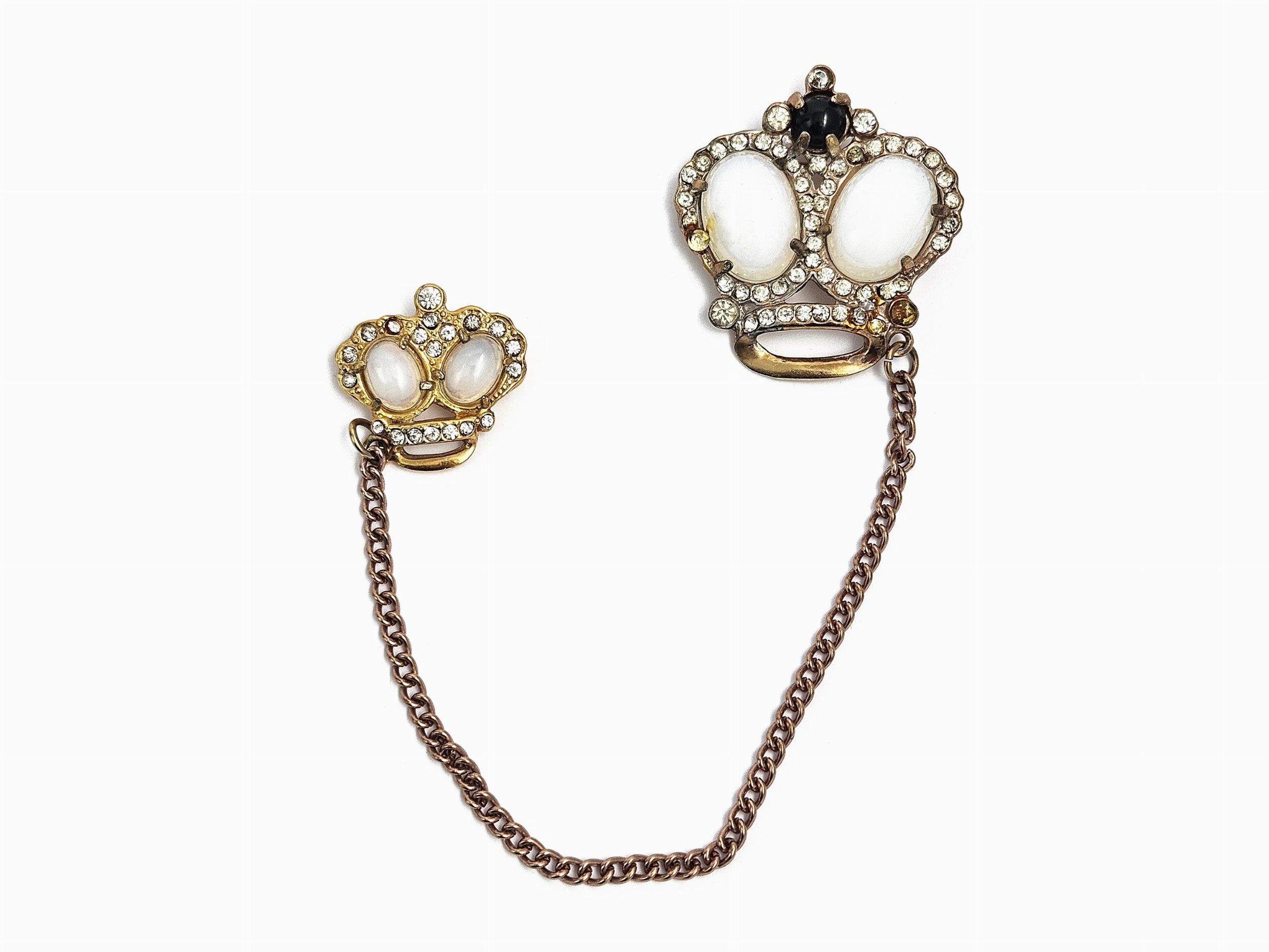 Anni Quaranta realizzata come due corone unite da una catena, in metallo giallo con strass incolore, lucite e una pietra color onice, lievi segni d'uso