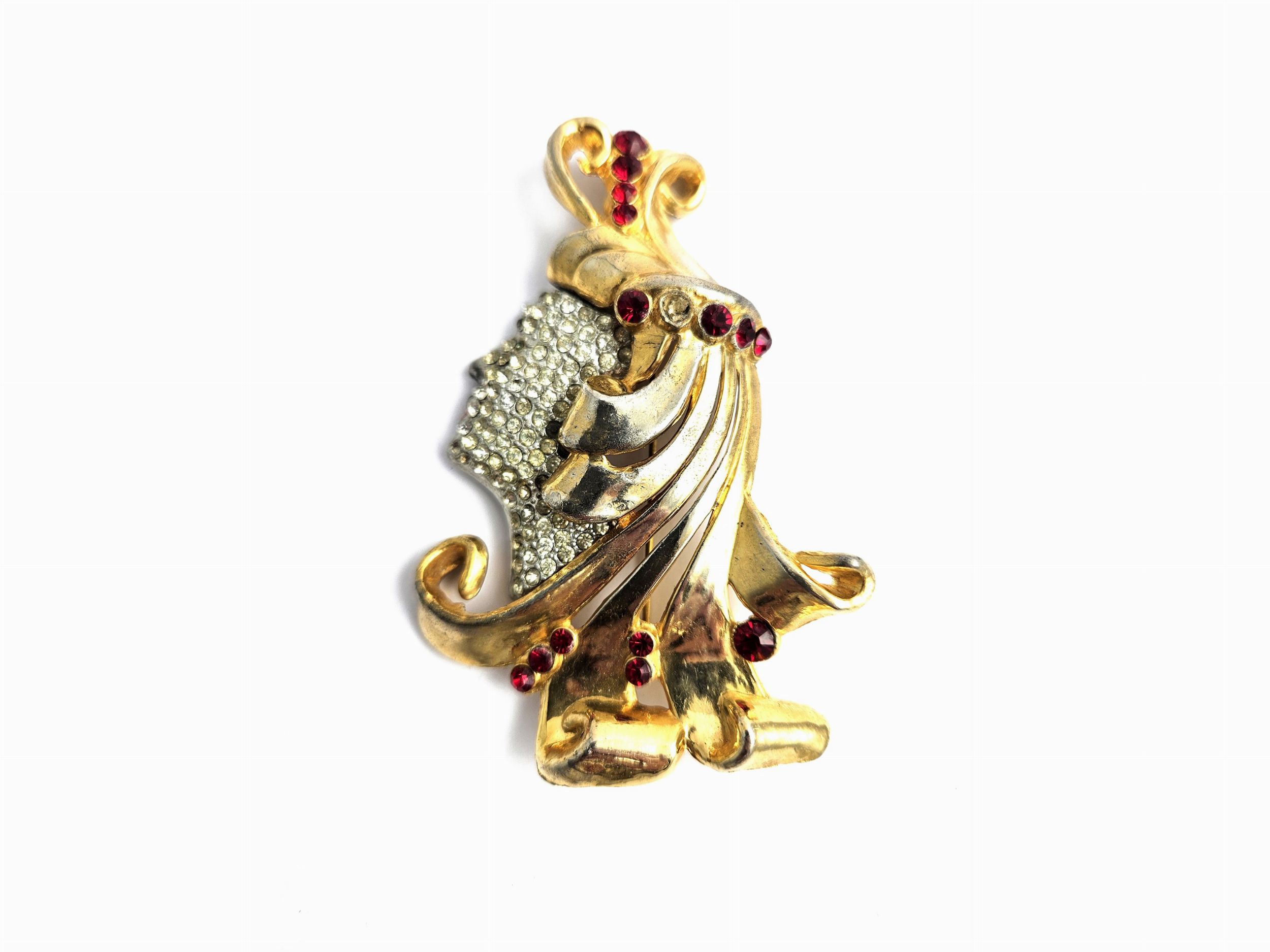America, Anni Quaranta in metallo giallo e bianco realizzata come un profilo femminile, con viso in pavé di strass incolore e strass color rubino tra i capelli (uno mancante), lievi difetti e mancanze