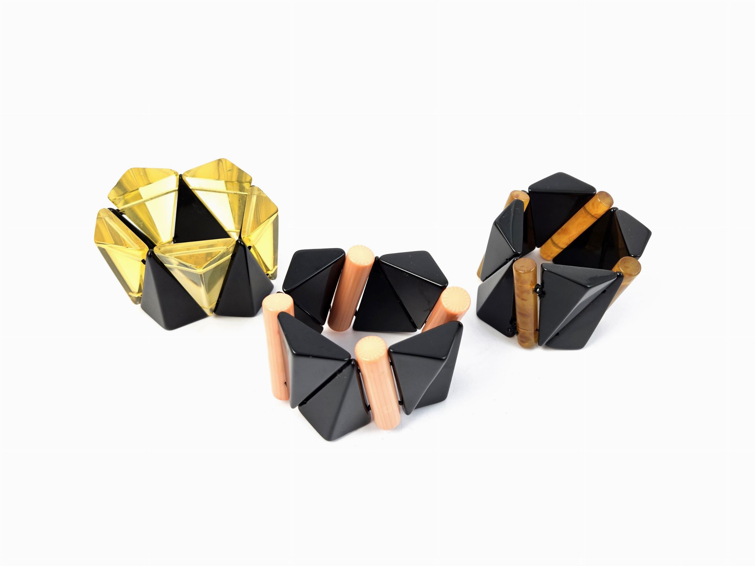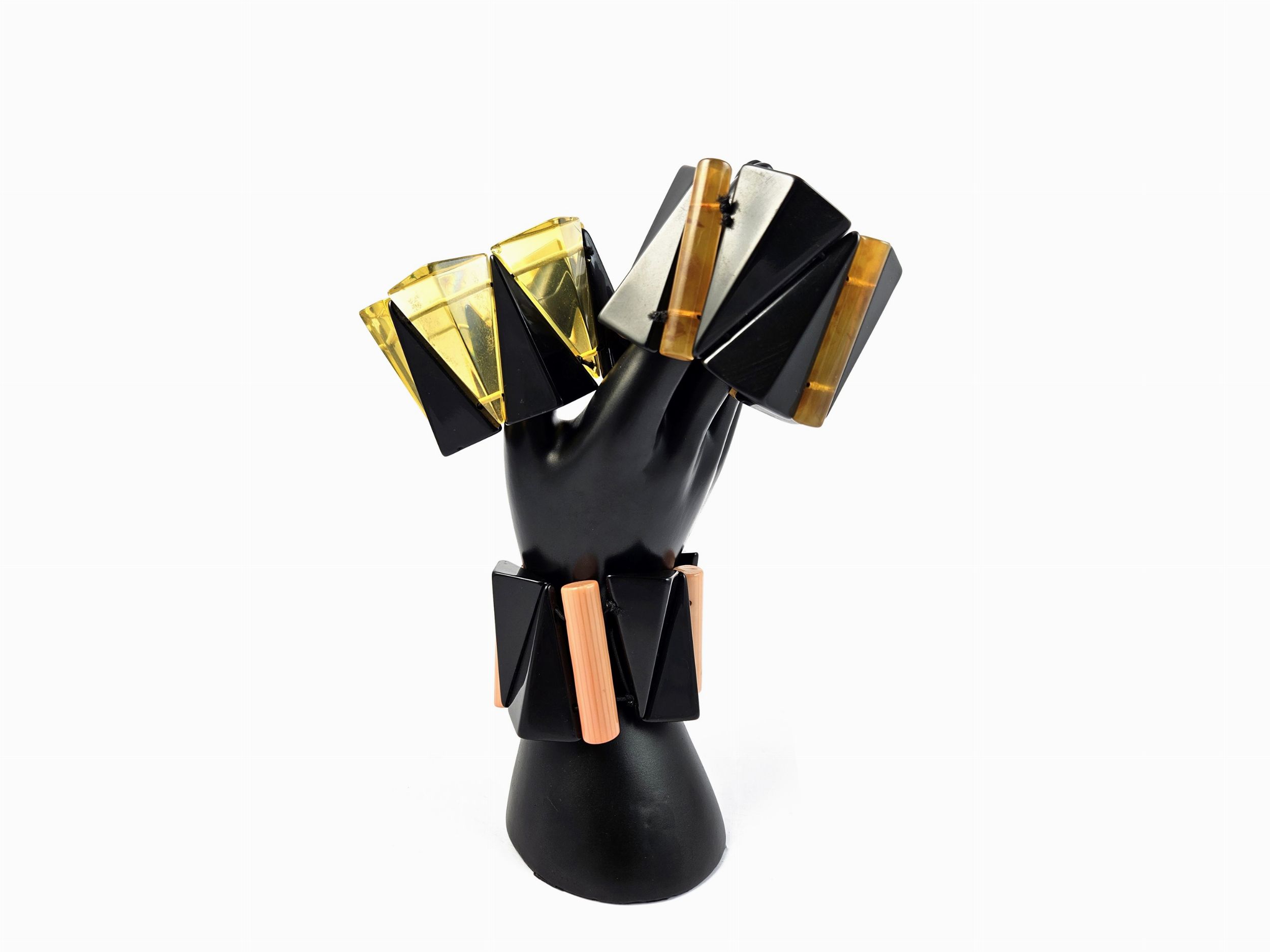 Anni Sessanta/Settanta realizzati con motivi a triangoli e cilindri nei toni del nero, salmone, color ambra e topazio montati su cordino elastico