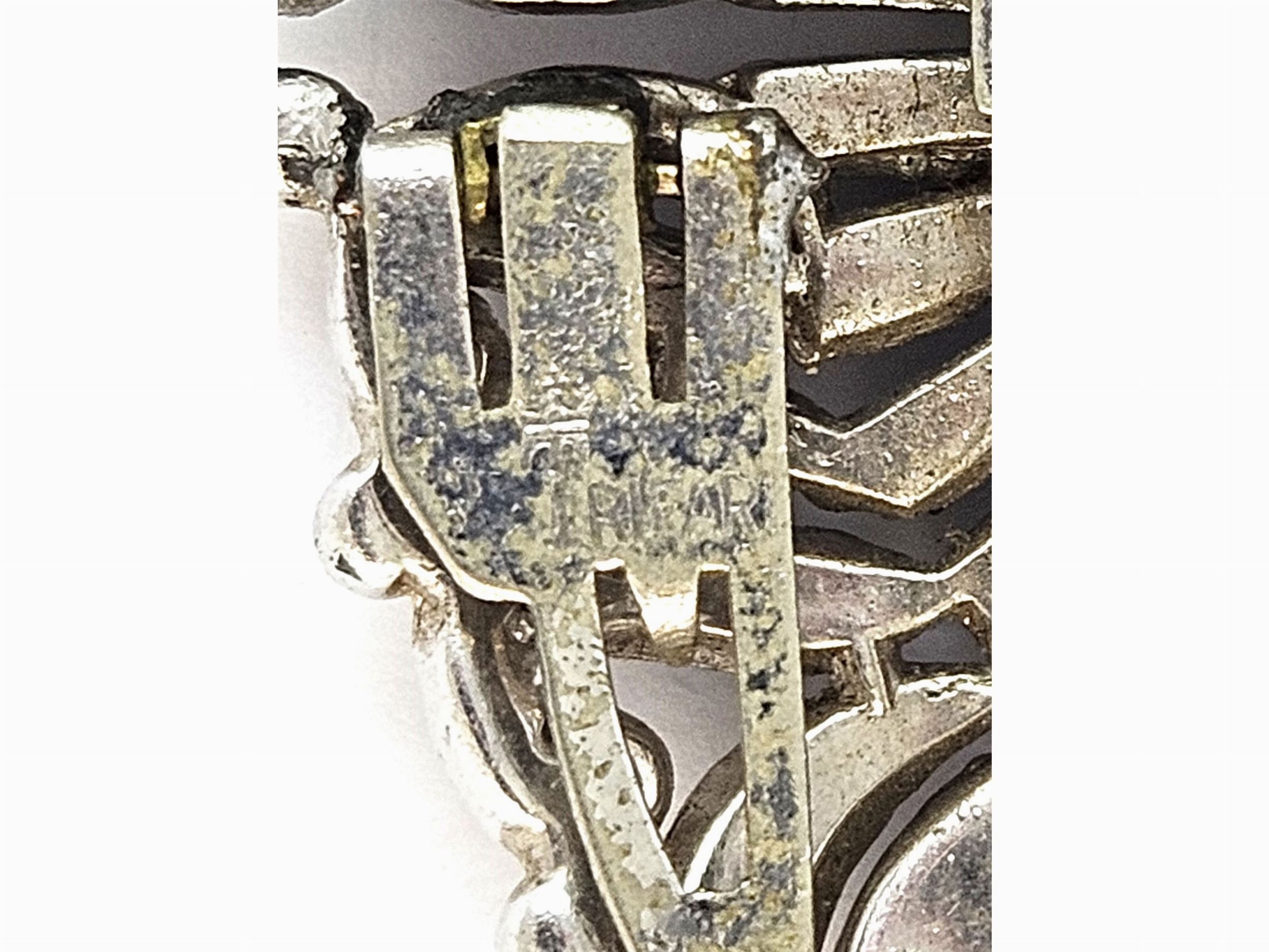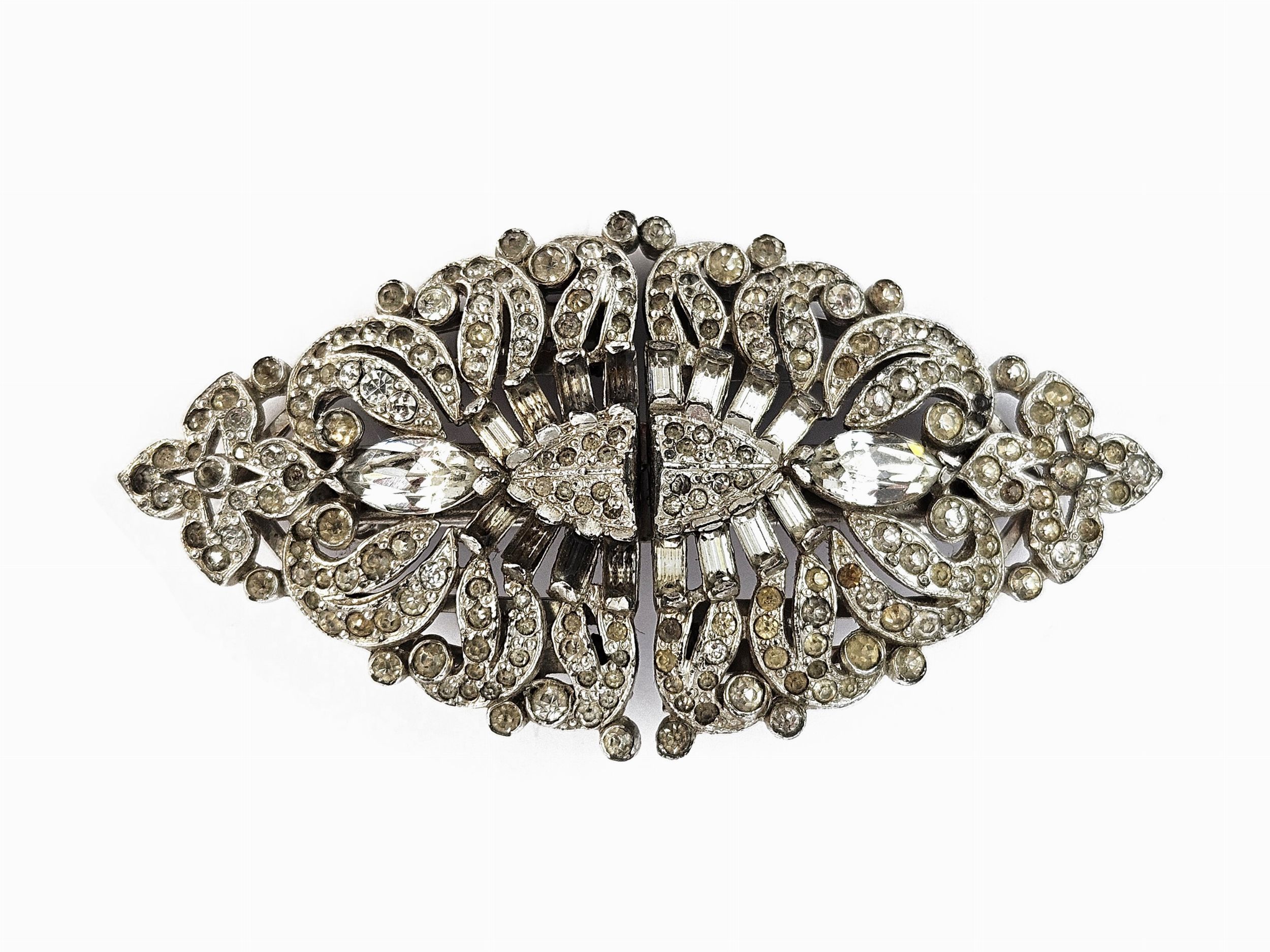 America, Anni Quaranta realizzata come due spille separabili, in metallo bianco con strass incolore e cristalli baguette e taglio marquise, lievi difetti e segni d'uso