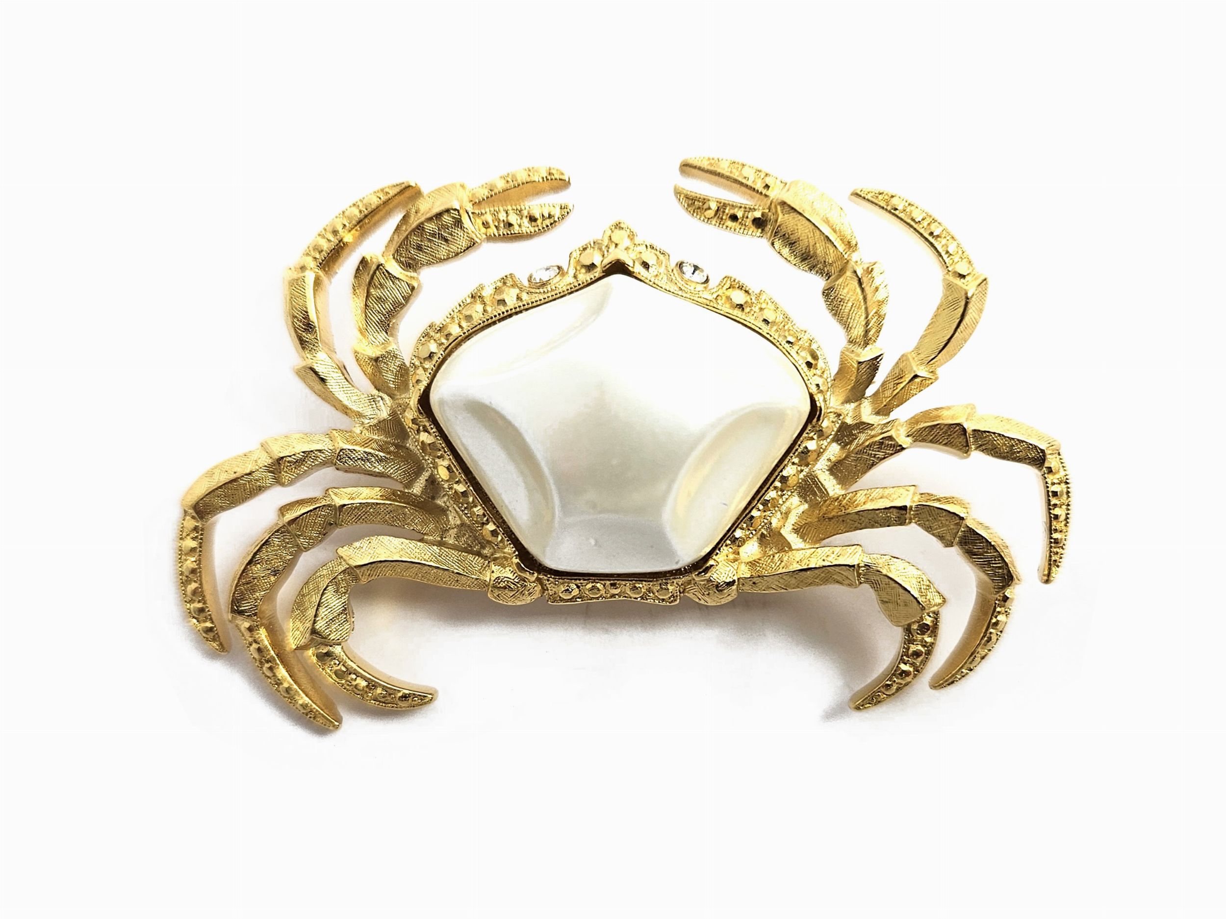 America, Anni Settanta realizzata a forma di granchio in metallo giallo, lucite e strass incolore, disegnata nel 1943-44 da Alfred Philippe