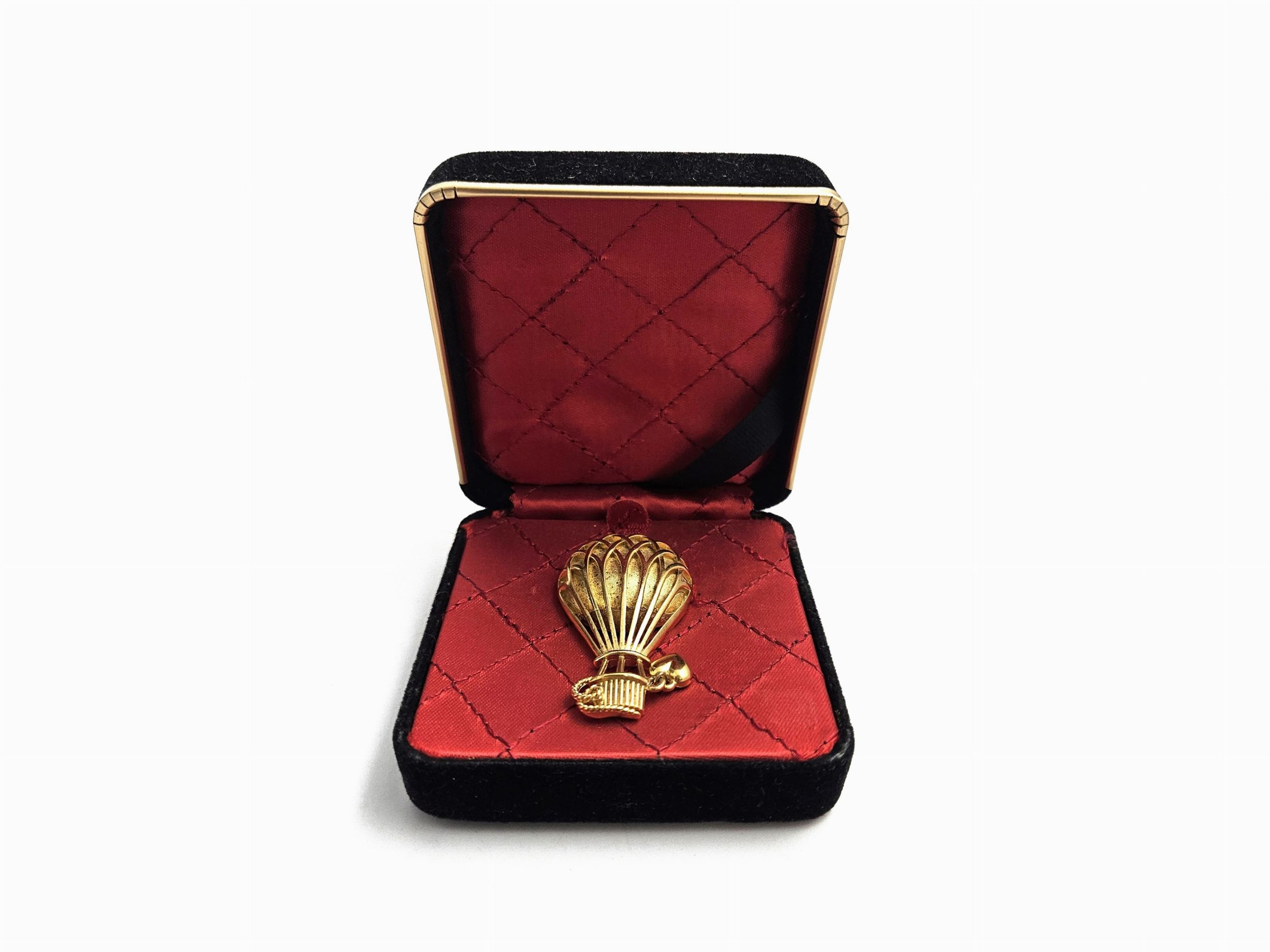 America, Anni Cinquanta/Sessanta realizzata a forma di mongolfiera, in metallo giallo con piccolo cuore pendente, entro scatola originale