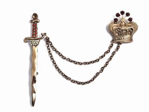 cm 9x5 America, Anni Sessanta/Settanta realizzata a forma di pesce marlin, in metallo giallo, smalti, strass [..]