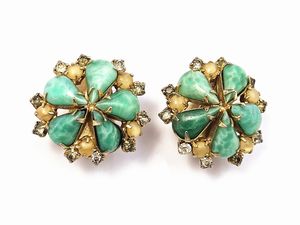 spilla cm 5x3,5, orecchini cm 2,7x2 (2) America, Anni Cinquanta/Sessanta in metallo giallo con grandi perle barocche [..]