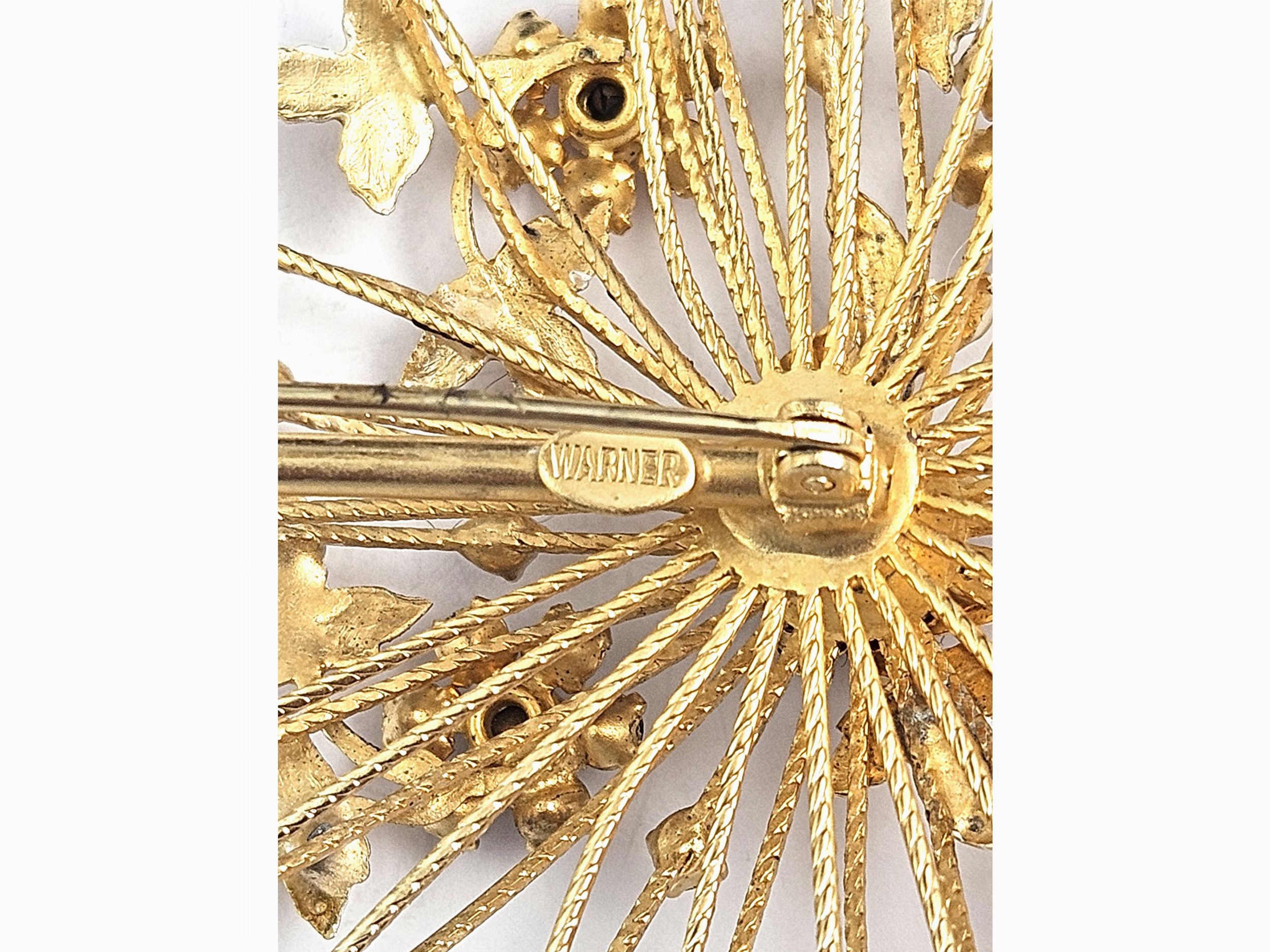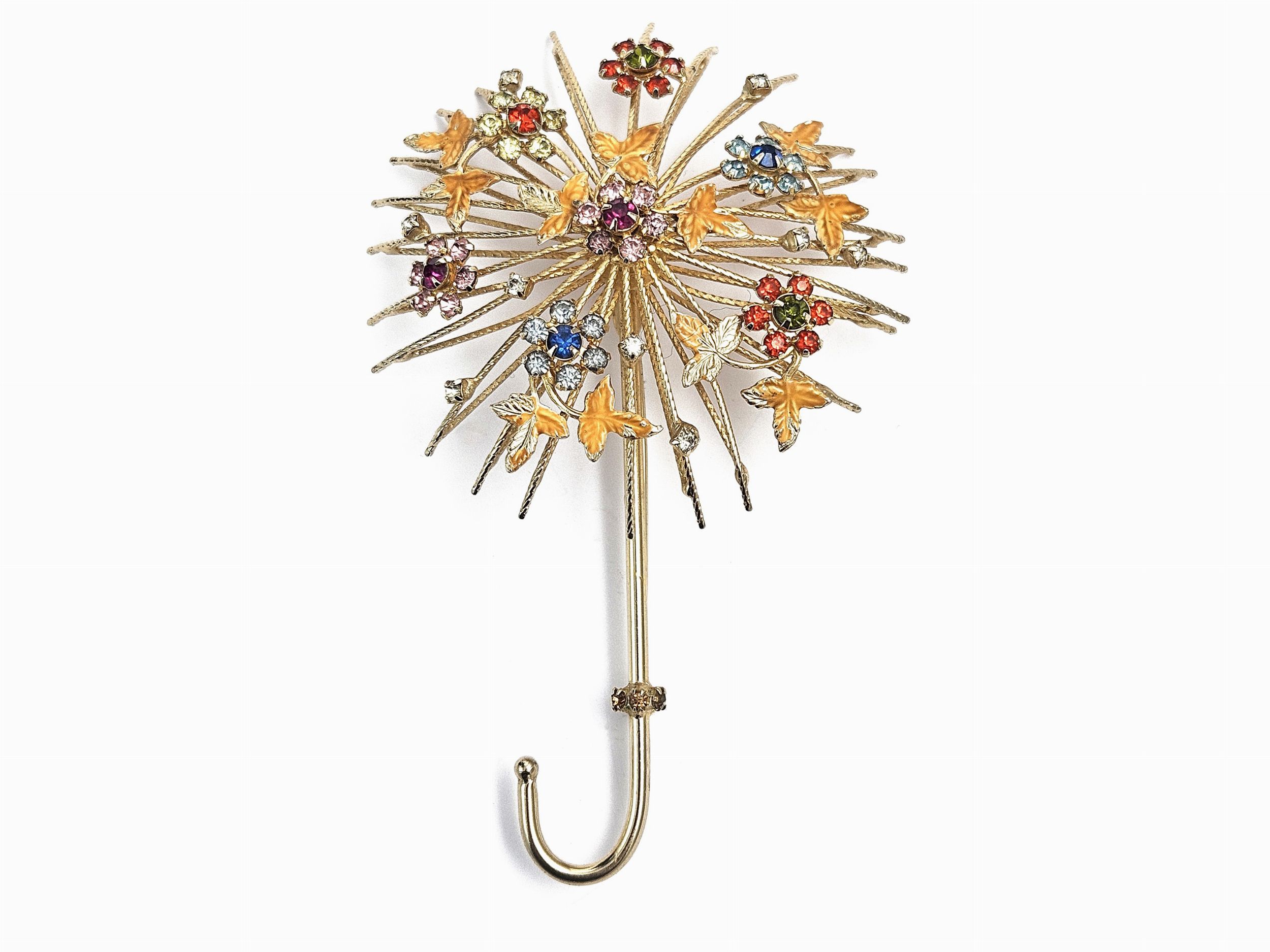 America, Anni Sessanta realizzata a forma di ombrello, in metallo giallo, decorata con fiori di strass colorati e foglie con smalti