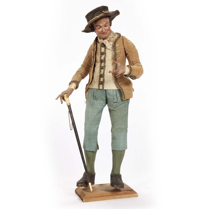 testa in terracotta policroma, mani e piedi in legno dipinto, occhi in vetro, manichino in fil di ferro ricoperto di stoppa, in abiti da festa con giacca e camicia crema ornate in oro, pantaloni turchesi, fazzoletto al collo e cappello nero sulla testa, nella mano sinistra impugna un bastone, alt. cm 37 (esclusa base)