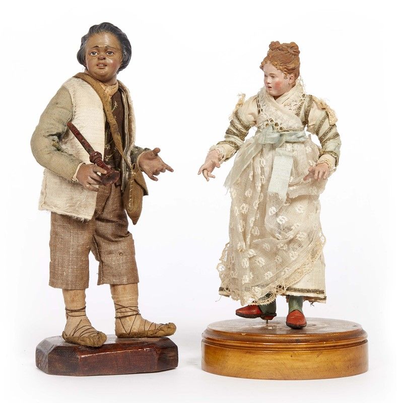 testa in terracotta policroma, mani e piedi in legno dipinto, occhi in vetro, manichino in fil di ferro ricoperto di stoppa. Composta da: fanciulla nobile, abbigliata con abito in seta e pizzo bianco e celeste ornato in oro con fiocco a cingere la vita, alt. cm 20,5; giovane pastore musico abbigliato con camicia verde e pantaloni marroni, gilet in pelliccia e borsello a tracolla, porta con sè un piffero, alt. cm 23 (escluse basi)