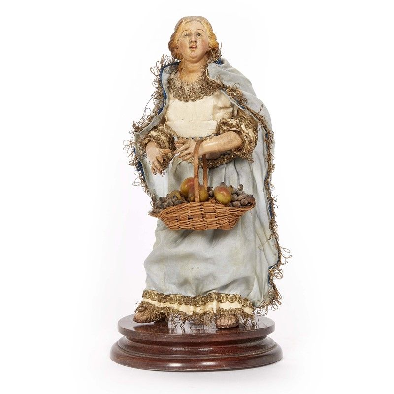 testa in terracotta policroma, mani e piedi in legno dipinto, occhi in vetro, manichino in fil di ferro ricoperto di stoppa, in abito da festa celeste e bianco con mantello celeste bordato in oro, regge tra le mani una cesta di frutta, alt. cm 22 (esclusa base)