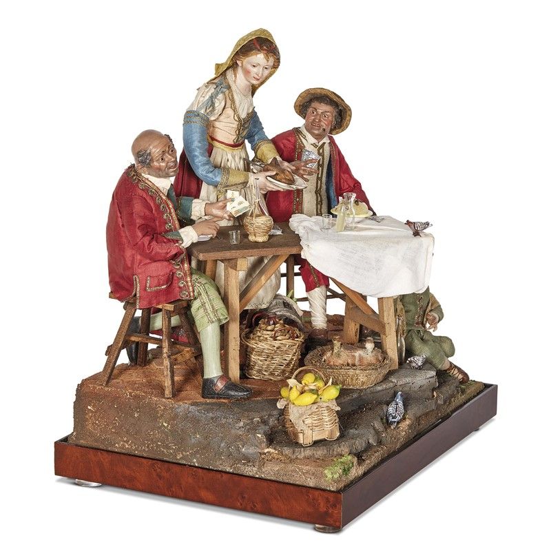 teste in terracotta policroma, mani e piedi in legno dipinto, occhi in vetro, manichino in fil di ferro ricoperto di stoppa, raffigurante giocatori di carte e ostessa in taverna. Composto da: giocatore di carte seduto, abbigliato con cappotto rosso, panciotto rosa, camicia bianca e pantaloni verdi, impugna tra le mani due carte da gioco, alt. cm 37; ostessa, abbigliata con abito con corpetto rosa e fiocchi celesti, gonna rossa con ricami in oro, grembiule crema in vita, nastro rosso tra i capelli e fazzoletto giallo sulla testa, regge tra le mani un vassoio con alimenti, alt. cm 40; giocatore di carte seduto, con porro sul viso, abbigliato con completo rosso e gilet bianco, cappello sulla testa, impugna tra le mani carte da gioco, alt. cm 38; giovane seduto, abbigliato con completo verde e gilet in pelliccia, tiene in mano mani una carta da gioco, alt. cm 23. Le quattro figure sono ambientate all’interno di un’osteria, e sopra la tavola imbandita sono collocati piatti, bicchieri, fiasco di vino, posate in metallo, carte da gioco, tovaglia; completano la composizione altri accessori: cesta di limoni, cesta di legumi, grande damigiana, cesta con galline e colombi. Custodito entro teca in plexiglass