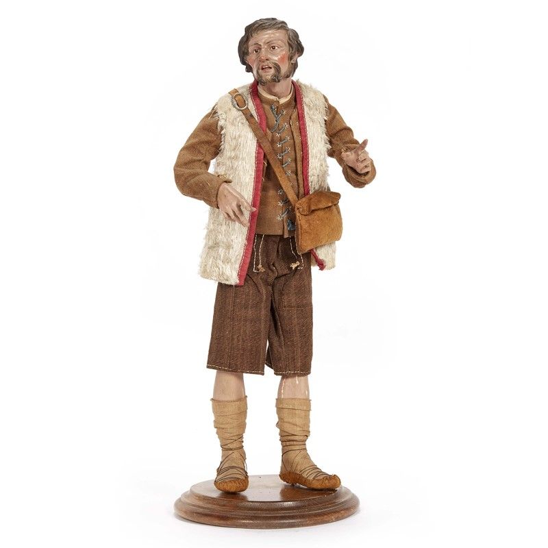 testa in terracotta policroma, mani e piedi in legno dipinto, occhi in vetro, manichino in fil di ferro ricoperto di stoppa, abbigliato con pantaloni e giacca marroni, gilet in pelliccia e borsello a tracolla, alt. cm 37 (esclusa base)