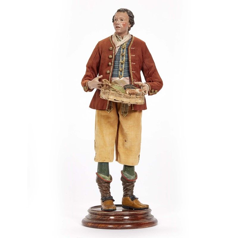 testa in terracotta policroma, mani e piedi in legno dipinto, occhi in vetro, manichino in fil di ferro ricoperto di stoppa, in abiti da festa con giacca rossa, camicia blu e pantaloni in velluto ornati in oro, fusciacca a quadri a cingere la vita e fazzoletto legato al collo, regge tra le mani una cesta con frutta e salumi, alt. cm 37 (esclusa base)