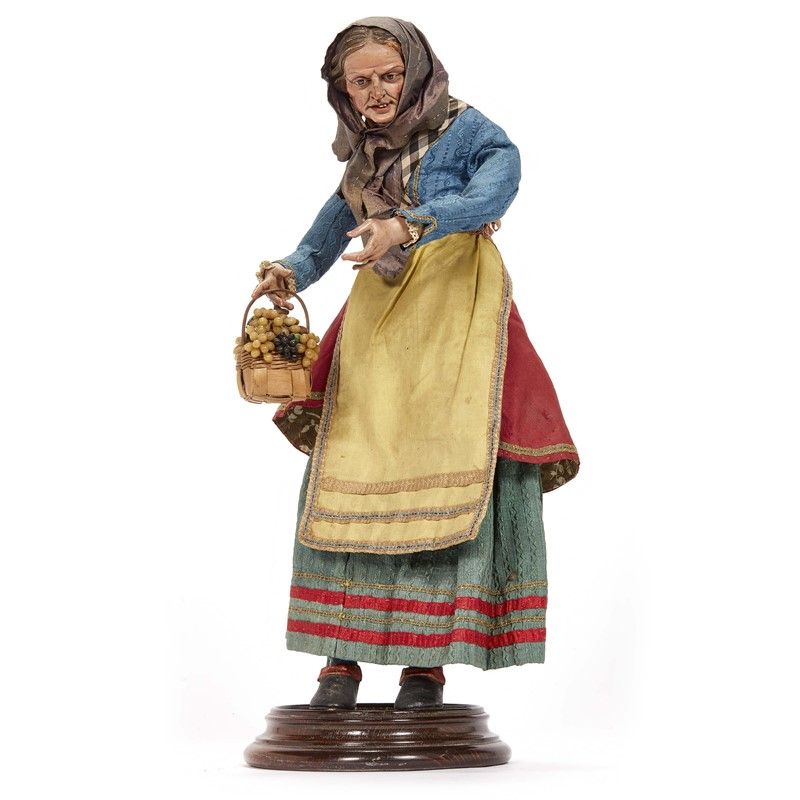 testa in terracotta policroma, mani e piedi in legno dipinto, occhi in vetro, manichino in fil di ferro ricoperto di stoppa, abbigliata in veste turchese con inserti rossi e grembiule giallo a cingere la vita, copricapo grigio, regge tra le mani un cestino di frutta, alt. cm 36 (esclusa base)