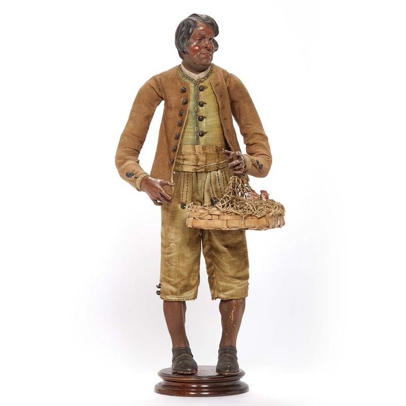testa in terracotta policroma, mani e piedi in legno dipinto, occhi in vetro, manichino in fil di ferro ricoperto di stoppa, abbigliato con giacca marrone, panciotto operato e pantaloni crema e fusciacca a righe a cingere la vita, regge tra le mani una cesta di polli in terracotta, alt. cm 47,5 (esclusa base)