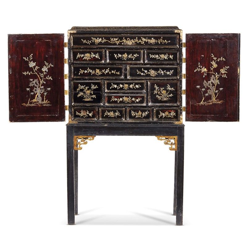in legno laccato, decoro in madreperla raffigurante figure in scene di giardino, con fiori e uccelli, che racchiudono una disposizione di quattordici cassetti laccati decorati, su un supporto cineserie europeo con gambe affusolate.