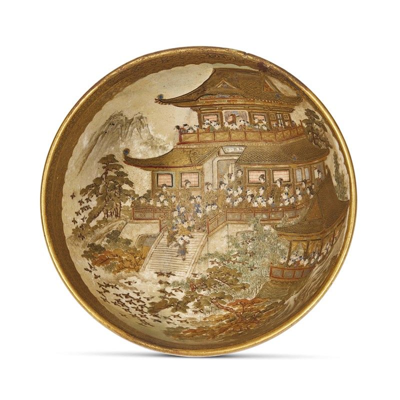 日本 明治时期 十九世纪 萨摩烧人物山水建筑纹碗 阪锦山堂 Hankizan-do 款 直径12厘米