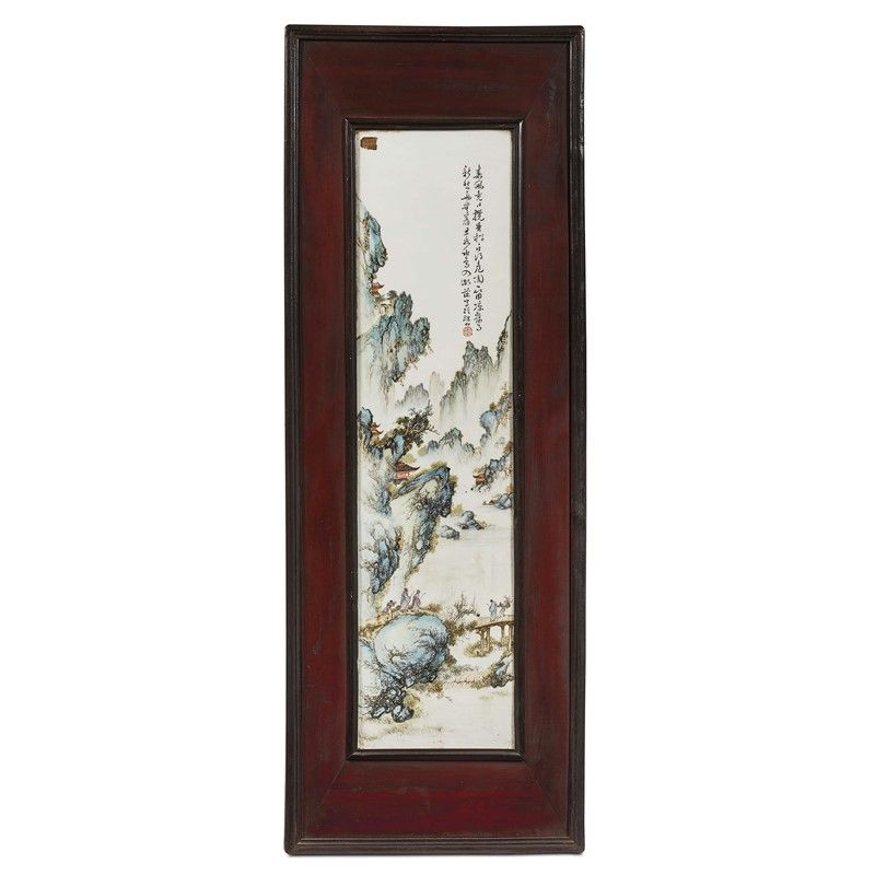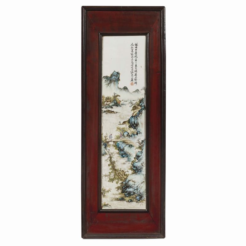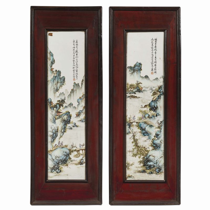 COPPIA DI PLACCHE, CINA, PERIODO DELLE REPUBBLICA (1912-1949) in porcellana policroma, incorniciate con legno pregiato, raffiguranti paesaggi incantevoli, reca il timbro di Zhang Peixuan. I dettagli finemente lavorati e l'uso sapiente dei colori riflettono l'estetica e la sensibilità dell'epoca. Dim.cm placca 79 x 20 民国 1912至1949 瓷板画一组 张沛轩印 瓷板尺幅79 x 20厘米