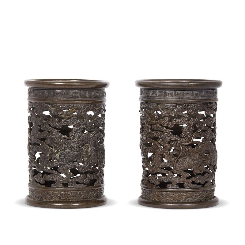 A PAIR OF BRONZE BRUSH HOLDER CARVED WITH DRAGONS HOVERING AMONG CLOUDS, CHINA, QING DYNASTY, 17TH-18TH CENTURY