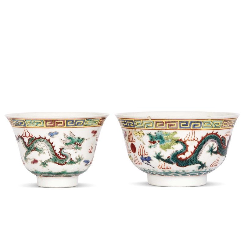 清 十九世纪 五彩龙纹盏两件 直径A 9,8 B 11,8厘米 高6厘米
