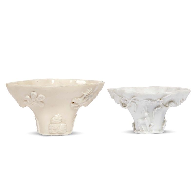 清 十八世纪 德化白瓷仿犀角杯一组两件 最长直径 10,5-12,5厘米