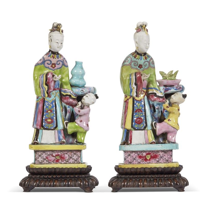 清 十九世纪上半叶 粉彩仕女教子立像 一组两件 净高 22厘米