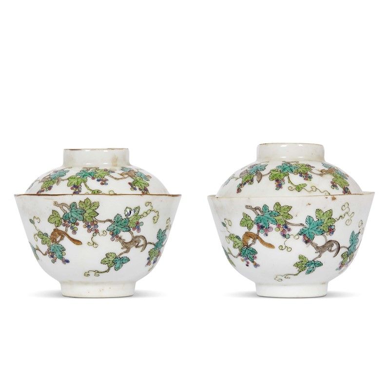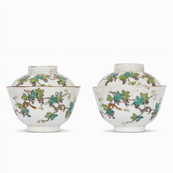DUE TAZZINE CON COPERCHIO, CINA, DINASTIA QING, SEC. XIX in porcellana policroma della famiglia verde raffiguranti scoiattoli su rami di vite. Alt. cm 8,9 Diam. cm 10 清 十九世纪 粉彩松鼠葡萄纹盖杯 高8,9 厘米 直径10厘米