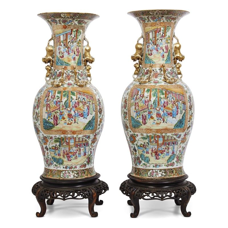 清 十九世纪 广彩宫廷人物故事纹狮耳大瓶一组两件 净高88厘米