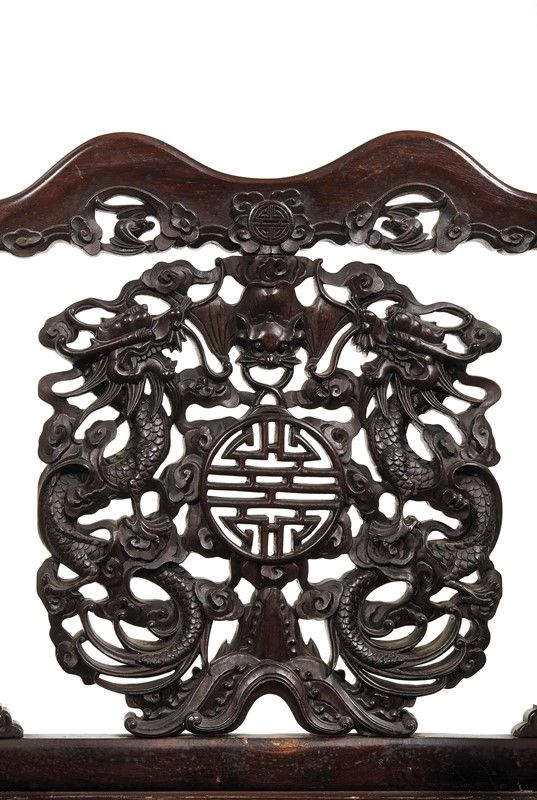 in legno duro, caratterizzate da schienali finemente intagliati con eleganti raffigurazioni di pipistrelli e draghi che si divertono con gemme di fuoco.
