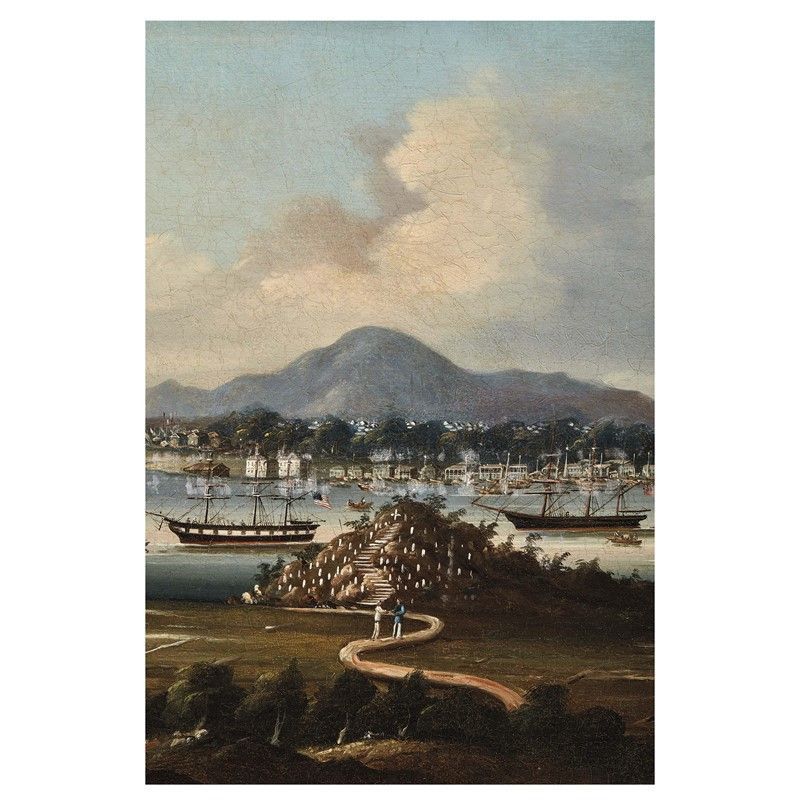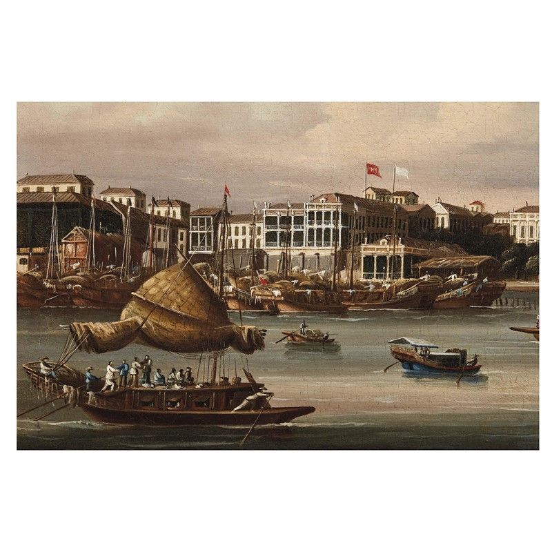 La rappresentazione di Canton mostra le hongs occidentali accanto alle bandiere americana, francese ed inglese. La presenza della chiesa sul lungomare, costruita nel 1847 e distrutta nell'incendio del 1856, fornisce un ancoraggio temporale per il dipinto.