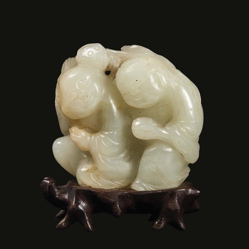 in giada bianca verde raffigurante due bambini, uno dei bambini tiene in mano un grazioso ramo di fiori, mentre l'altro tiene con cura un piccolo vasetto con coperchio.