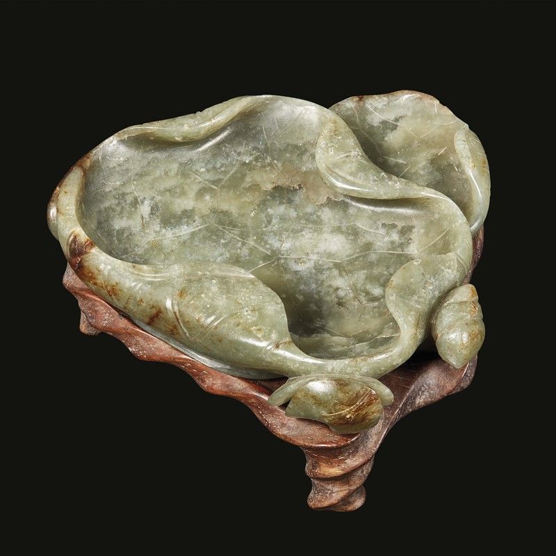 realizzato in giada verde grigia intagliata con la forma dell'oggetto imita con grande raffinatezza le foglie di loto.