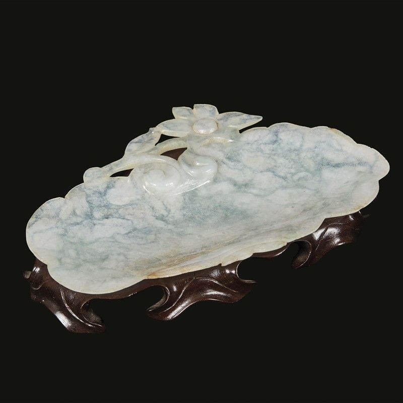 probabilmente in giadeite di forma nuvole Lingzhi con un ramo di fiore, con la base in legno a forma di foglia di fiore loto