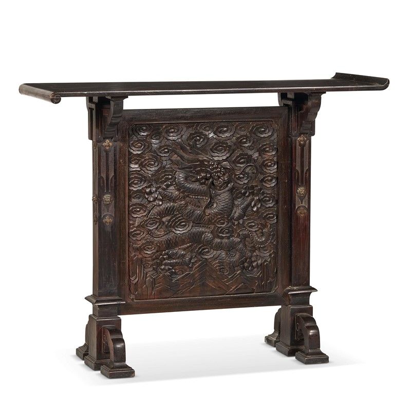 清 十九世纪 漆墨色雕云龙纹板 改制为桌 总高 111.5厘米 桌面宽 136.6 厘米 底座宽 90厘米 深度 42.4厘米