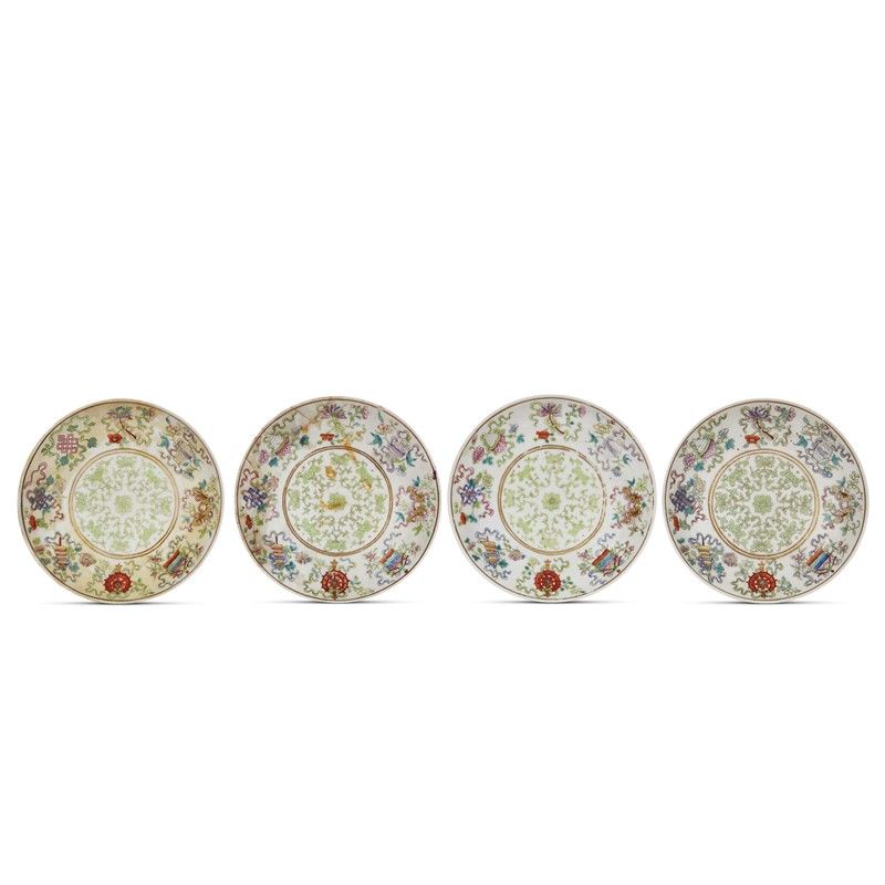 清 十九至二十世纪 粉彩莲托八宝纹碟 大清光绪年制 底款 一组四件 直径 15,5 - 16,2厘米