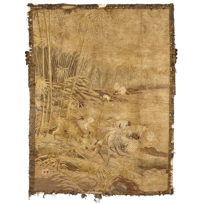 RICAMO, GIAPPONE, PERIODO MEIJI, SEC. XIX-XX in fibre raffigurante una scena di caccia volpe tra galli, immersa in un ambiente naturale con bambù e rami di fiori. Un'opera che incarna l'arte e la maestria del ricamo giapponese, catturando la grazia e la dinamicità della natura selvaggia. Dim. cm 196 x 142 日本 明治 十九至二十世纪 狐狸狩猎公鸡刺绣挂毯 尺幅 196 x 142厘米