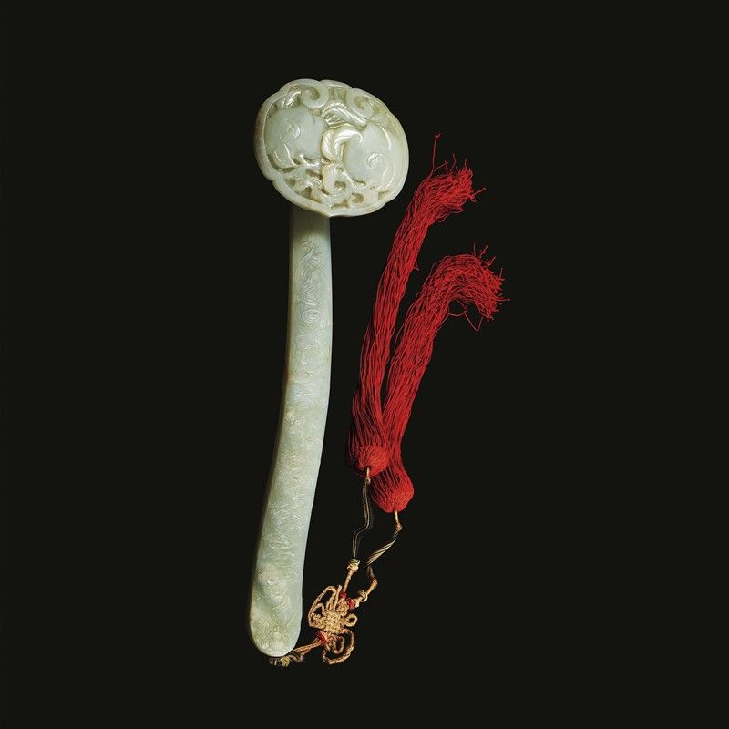realizzato in giada verde pallido, caratterizzato da un'impugnatura finemente intagliata con cinque pipistrelli tra le nuvole Ruyi, mentre la testa della Ruyi mostra l'immagine di due pesche adornate con rami.