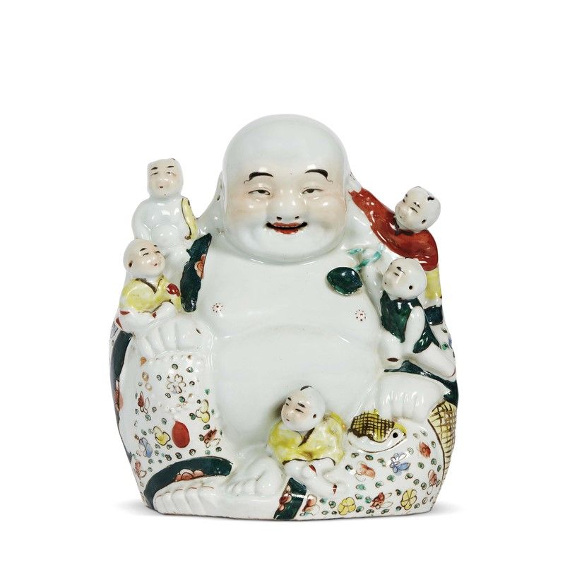 SCULTURA, CINA, PERIODO DELLA REPUBBLICA (1912-1949) in porcellana policroma raffigurante Buddha con bambini, reca firma You Longsheng Zao 游隆盛造 sotto la base. Alt. cm 24,6 民国时期 1912至1949 粉彩送子佛像 游隆盛造款印 高 24,6厘米