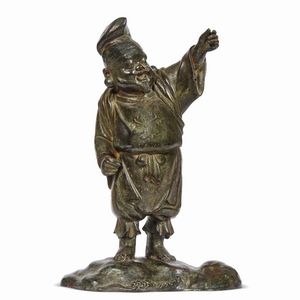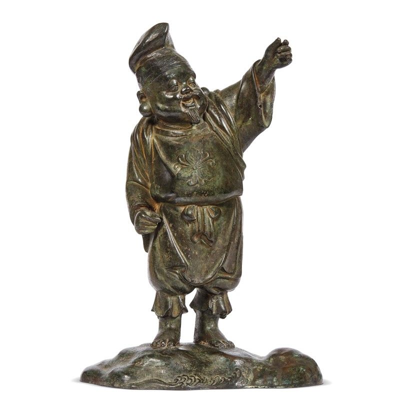 in bronzo raffigurante un anziano che indossa un vestito antico (kariginu 狩衣) e che si trova vicino ad un fiume o un mare.